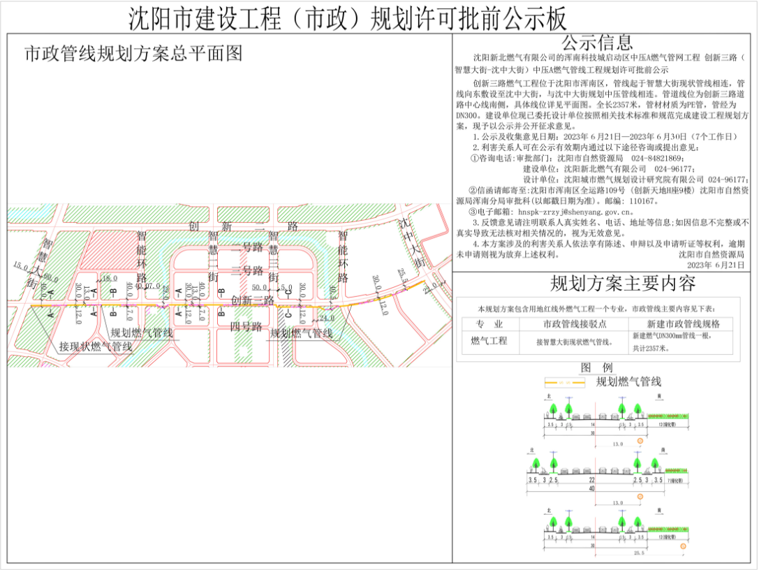创新三路燃气工程位于沈阳市浑南区,管线起于智慧大街现状管线相连,管线向东敷设至沈中大街,与沈中大街规划中压管线相连。管道线位为沈中大街道路中心线西侧40米。全长2357米,管材材质为PE管,管经为DN300。建设单位现已委托设计单位按照相关技术标准和规范完成建设工程规划设计方案,现予以公示并公开征求意见。 1、公示及收集意见日期:2023年6月21日——2023年6月30日(7个工作日) 2、利害关系人可在公示有效期内通过以下途径咨询或提出意见: ①咨询电话:审批部门:沈阳市自然资源局,024-84821869; 建设单位:沈阳新北燃气有限公司,024-96177; 设计单位:沈阳城市燃气规划设计研究院有限公司, 024-96177。 ②信函请邮寄至:沈阳市浑南区全运路109号(创新天地H座9楼)沈阳市自然资源局浑南分局审批科(以邮戳日期为准) 邮编:110167。 ③电子邮箱:hnspk-zrzyj@shenyang.gov.cn。 3、反馈意见请注明联系人真实姓名、电话、地址等信息;如因信息不完整或不真实导致无法核对相关情况的,视为无效意见。 4、本方案涉及的利害关系人依法享有陈述、申辩以及申请听证等权利,逾期未申请则视为放弃上述权利。 沈阳市自然资源局 2023年6月21 日