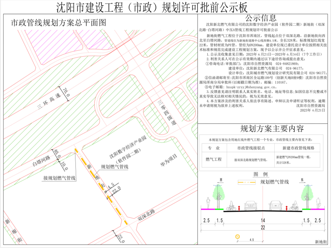 沈阳新北燃气有限公司的沈阳数字经济产业园(软件园二期)燃气配套新地街(双深北路-白塔河路)中压A管线工程规划许可批前公示