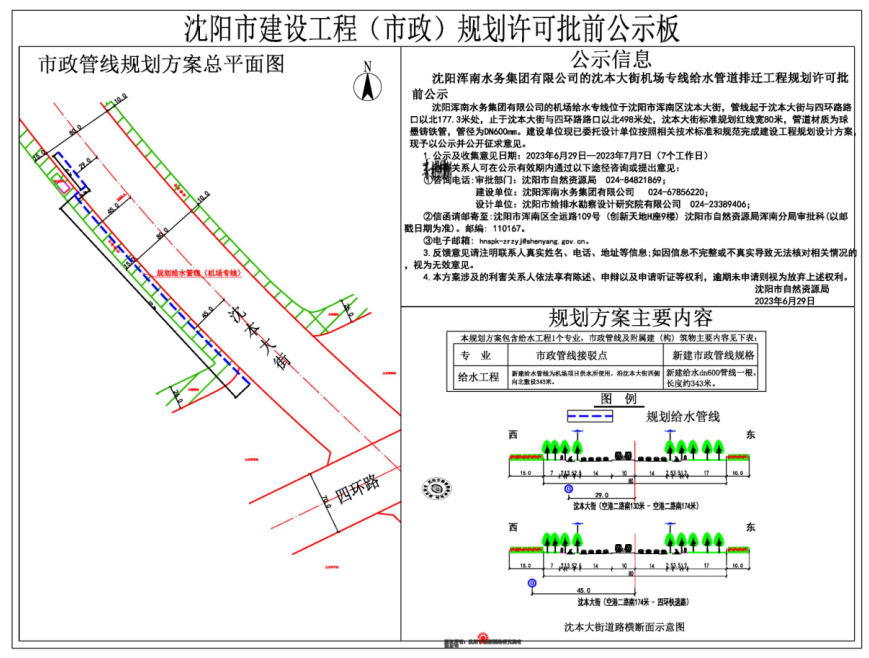 沈阳浑南水务集团有限公司的沈本大街机场专线给水管道排迁工程规划许可批前公示 沈阳浑南水务集团有限公司的机场给水专线位于沈阳市浑南区沈本大街,管线起于沈本大街与四环路路口以北177.3米处,止于沈本大街与四环路路口以北498米处,沈本大街标准规划红线宽80米,管道材质为球墨铸铁管,管径为DN600mm。建设单位现已委托设计单位按照相关技术标准和规范完成建设工程规划设计方案,现予以公示并公开征求意见。 1、公示及收集意见日期:2023年6月29日——2023年7月7日(7个工作日) 2、利害关系人可在公示有效期内通过以下途径咨询或提出意见: ①咨询电话:审批部门:沈阳市自然资源局,024-84821869; 建设单位:沈阳浑南水务集团有限公司,024-67856220; 设计单位:沈阳市给排水勘察设计研究院有限公司,024-23389406。 ②信函请邮寄至: 沈阳市浑南区全运路109号 (创新天地H座9楼) 沈阳市自然资源局浑南分局审批科(以邮戳日期为准)。邮编: 110167。 ③电子邮箱:hnspk-zrzyj@shenyang.gov.cn。 3、反馈意见请注明联系人真实姓名、电话、地址等信息;如因信息不完整或不真实导致无法核对相关情况的,视为无效意见。 4、本方案涉及的利害关系人依法享有陈述、申辩以及申请听证等权利,逾期未申请则视为放弃上述权利。 沈阳市自然资源局 2023年6月29日