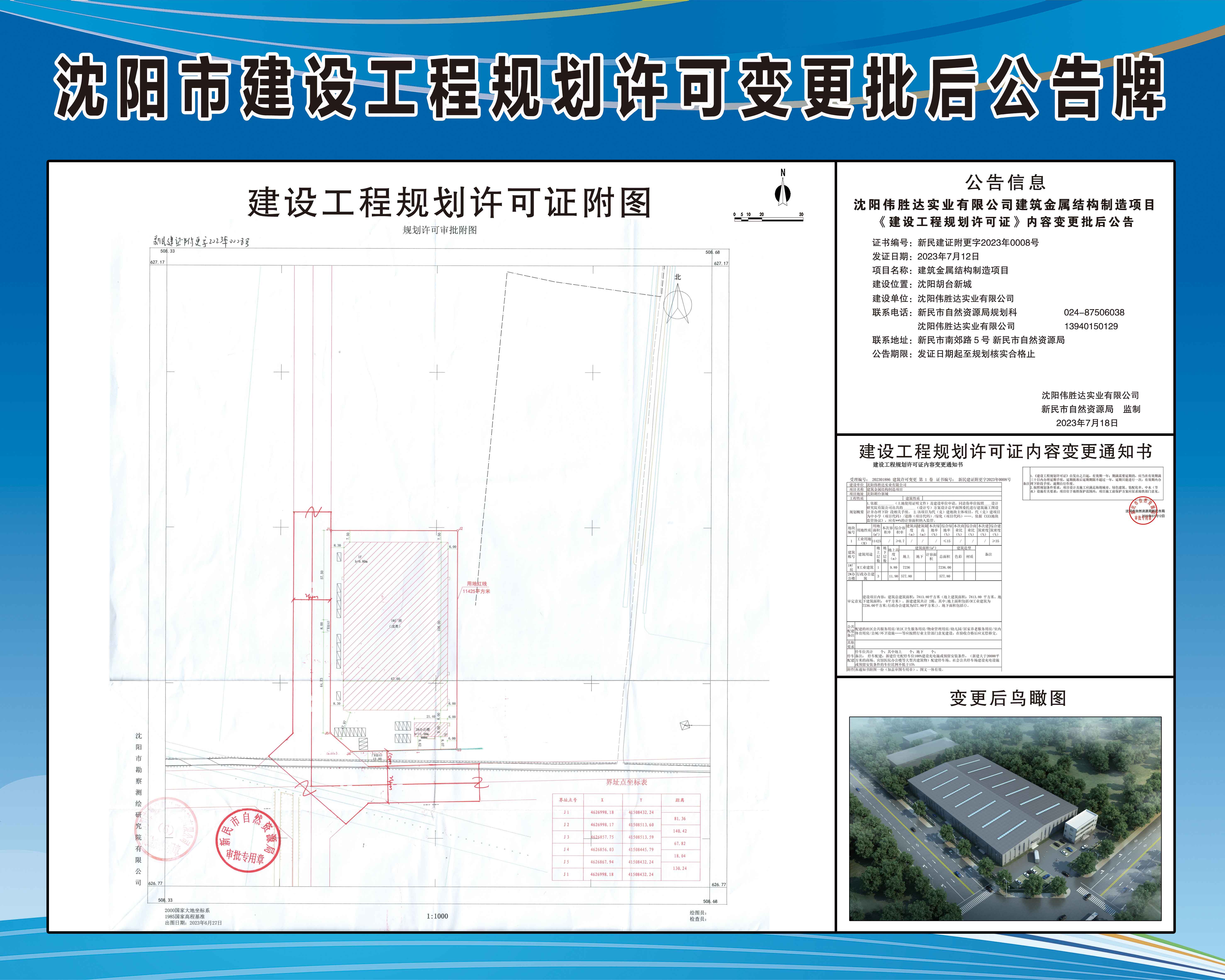 沈阳伟胜达实业有限公司建筑金属结构制造项目《建设工程规划许可证》内容变更批后公告
