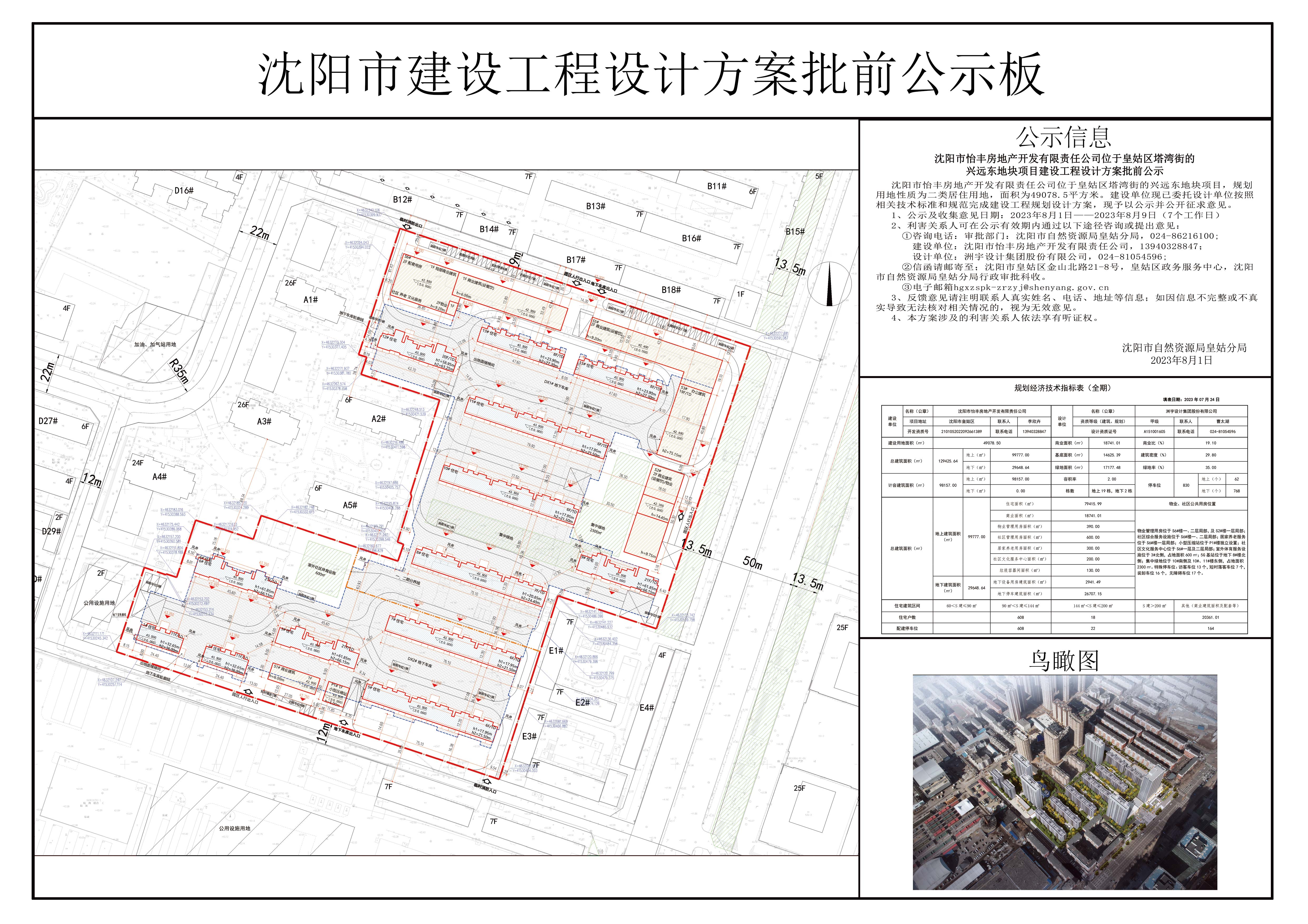 沈阳市怡丰房地产开发有限责任公司位于皇姑区塔湾街的兴远东地块项目,规划用地性质为二类居住用地,面积为49078.5平方米。建设单位现已委托设计单位按照相关技术标准和规范完成建设工程规划设计方案,现予以公示并公开征求意见。 1、公示及收集意见日期:2023年8月1日——2023年8月9日(7个工作日) 2、利害关系人可在公示有效期内通过以下途径咨询或提出意见: ①咨询电话:审批部门:沈阳市自然资源局皇姑分局,024-86216100; 建设单位:沈阳市怡丰房地产开发有限责任公司,13940328847; 设计单位:洲宇设计集团股份有限公司,024-81054596; ②信函请邮寄至;沈阳市皇姑区金山北路21-8号,皇姑区政务服务中心,沈阳市自然资源局皇姑分局行政审批科收。 ③电子邮箱:hgxzspk-zrzyj@shenyang.gov.cn 3、反馈意见请注明联系人真实姓名、电话、地址等信息;如因信息不完整或不真实导致无法核对相关情况的,视为无效意见。 4、本方案涉及的利害关系人依法享有听证权。