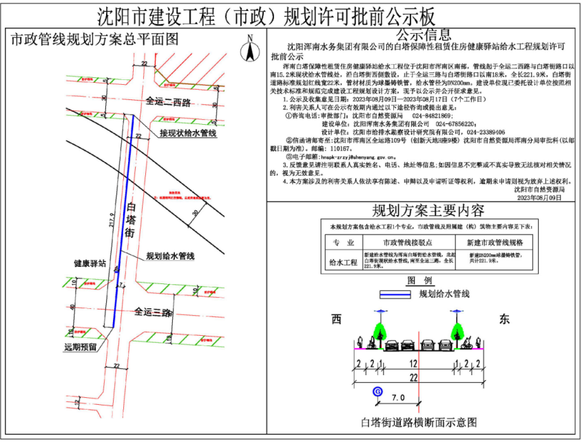 沈阳浑南水务集团有限公司的白塔保障性租赁住房健康驿站给水工程规划许可批前公示 浑南白塔保障性租赁住房健康驿站给水工程位于沈阳市浑南区南部,管线起于全运二西路与白塔街路口以南15.2米现状给水管线处,止于全运三路与白塔街路口以南18米,全长221.9米,白塔街道路标准规划红线宽22米,管材材质为球墨铸铁管,给水管径为DN200mm。建设单位现已委托设计单位按照相关技术标准和规范完成建设工程规划设计方案,现予以公示并公开征求意见。 1、公示及收集意见日期:2023年8月9日——2023年8月17日(7个工作日) 2、利害关系人可在公示有效期内通过以下途径咨询或提出意见: ①咨询电话:审批部门:沈阳市自然资源局,024-84821869; 建设单位:沈阳浑南水务集团有限公司,024-67856220; 设计单位:沈阳市给排水勘察设计研究院有限公司,024-23389406。 ②信函请邮寄至: 沈阳市浑南区全运路109号 (创新天地H座9楼) 沈阳市自然资源局浑南分局审批科(以邮戳日期为准)。邮编: 110167。 ③电子邮箱:hnspk-zrzyj@shenyang.gov.cn。 3、反馈意见请注明联系人真实姓名、电话、地址等信息;如因信息不完整或不真实导致无法核对相关情况的,视为无效意见。 4、本方案涉及的利害关系人依法享有陈述、申辩以及申请听证等权利,逾期未申请则视为放弃上述权利。 沈阳市自然资源局 2023年8月9日