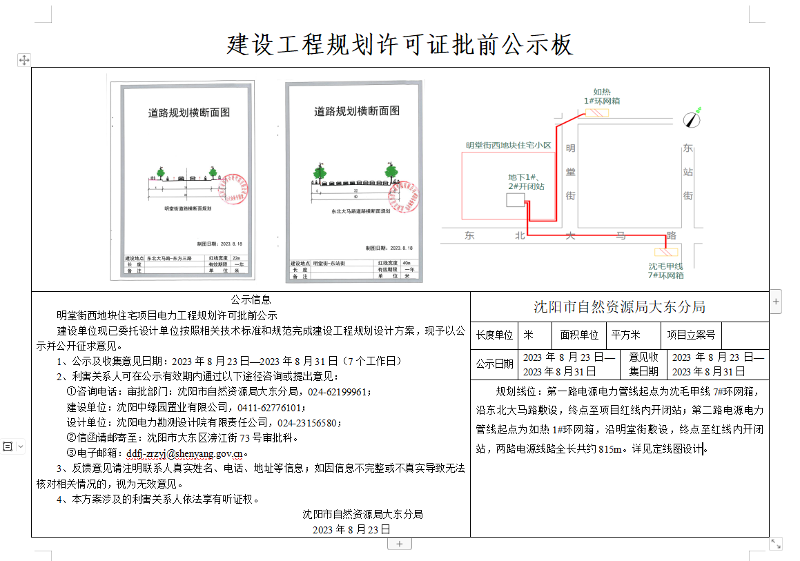 公示信息 明堂街西地块住宅项目电力工程规划许可批前公示 建设单位现已委托设计单位按照相关技术标准和规范完成建设工程规划设计方案,现予以公示并公开征求意见。 1、公示及收集意见日期:2023年8月23日—2023年8月31日(7个工作日) 2、利害关系人可在公示有效期内通过以下途径咨询或提出意见: ①咨询电话:审批部门:沈阳市自然资源局大东分局,024-62199961; 建设单位:沈阳中绿园置业有限公司,0411-62776101; 设计单位:沈阳电力勘测设计院有限责任公司,024-23156580; ②信函请邮寄至:沈阳市大东区滂江街73号沈阳市自然资源局大东分局审批科。 ③电子邮箱:ddfj-zrzyj@shenyang.gov.cn。 3、反馈意见请注明联系人真实姓名、电话、地址等信息;如因信息不完整或不真实导致无法核对相关情况的,视为无效意见。 4、本方案涉及的利害关系人依法享有听证权。 沈阳市自然资源局大东分局 2023年8月23日