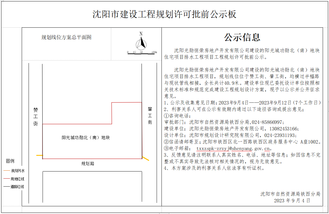 沈阳光勋恒荣房地产开发有限公司建设的阳光城功勋北(南)地块住宅项目排水工程项目,规划线位位于赞工街、肇工街,均横过半幅路与现状管线相接,全长共计40.9米。建设单位现已委托设计单位按照相关技术标准和规范完成建设工程规划设计方案,现予以公示并公开征求意见。 1、公示及收集意见日期:2023年9月4日——2023年9月12日(7个工作日) 2、利害关系人可在公示有效期内通过以下途径咨询或提出意见; ①咨询电话: 审批部门:沈阳市自然资源局铁西分局,024-85866997; 建设单位:沈阳光勋恒荣房地产开发有限公司,13082453166; 设计单位:沈阳市规划设计研究院有限公司,024-23931193; ②信函请邮寄至;沈阳市铁西区北一西路铁西区政务服务中心A座1002。 ③电子邮箱: txxzspk-zrzyj@shenyang.gov.cn。 3、反馈意见请注明联系人真实姓名、电话、地址等信息;如因信息不完整或不真实导致无法核对相关情况的,视为无效意见。 4、本方案涉及的利害关系人依法享有听证权。