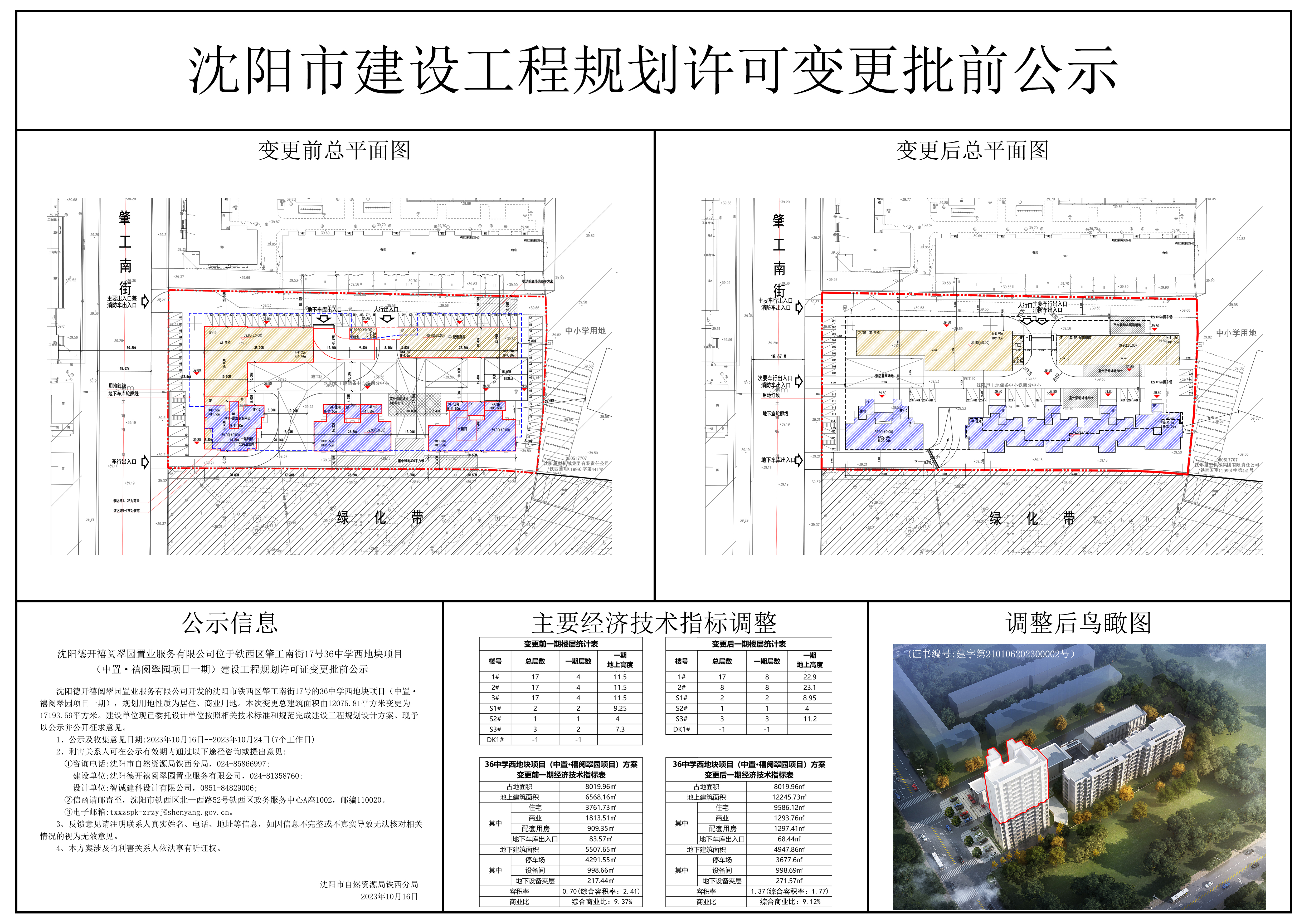沈阳德开禧阅翠园置业服务有限公司位于铁西区肇工南街17号36中学西地块项目(中置·禧阅翠园项目一期)建设工程规划许可证变更批前公示 沈阳德开禧阅翠园置业服务有限公司开发的沈阳市铁西区肇工南街17号的36中学西地块项目(中置·禧阅翠园项目一期),规划用地性质为居住、商业用地。本次变更总建筑面积由12075.81平方米变更为17193.59平方米。建设单位现已委托设计单位按照相关技术标准和规范完成建设工程规划设计方案。现予以公示并公开征求意见。 1、公示及收集意见日期:2023年10月16日--2023年10月24日(7个工作日) 2、利害关系人可在公示有效期内通过以下途径咨询或提出意见: ①咨询电话:沈阳市自然资源局铁西分局,024-85866997; 建设单位:沈阳德开禧阅翠园置业服务有限公司,024-81358760; 设计单位:智诚建科设计有限公司,0851-84829006; ②信函请邮寄至,沈阳市铁西区北一西路52号铁西区政务服务中心A座1002,邮编110020。 ③电子邮箱:txxzspk-zrzyj@shenyang.gov.cn。 3、反馈意见请注明联系人真实姓名、电话、地址等信息,如因信息不完整或不真实导致无法核对相关情况的视为无效意见。 4、本方案涉及的利害关系人依法享有听证权。 沈阳市自然资源局铁西分局 2023年10月16日