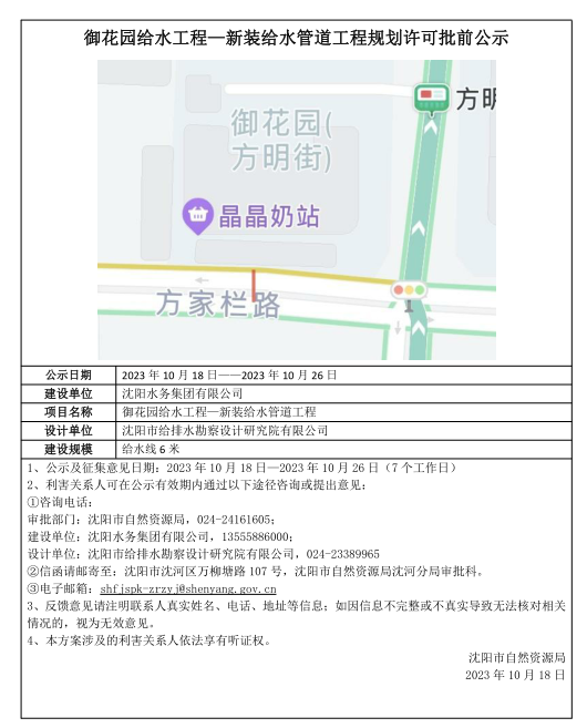 御花园给水工程—新装给水管道工程,建设单位现已委托设计单位按照相关技术标准和规范完成建设工程规划设计方案,现予以公示并公开征求意见。 1、公示及收集意见日期:2023年10月18日----2023年10月26日(7个工作日) 2、利害关系人可在公示有效期内通过以下途径咨询或提出意见: ①咨询电话: 审批部门:沈阳市自然资源局,024-24161605; 建设单位:沈阳水务集团有限公司,13555886000; 设计单位:沈阳市给排水勘察设计研究院有限公司,024-23389965 ②信函请邮寄至:沈阳市沈河区万柳塘路 107号 沈阳市自然资源局沈河分局审批科。 ③电子邮箱:shfjspk-zrzyj@shenyang.gov.cn 3、反馈意见请注明联系人真实姓名、电话、地址等信息;如因信息不完整或不真实导致无法核对相关情况的,视为无效意见。 4、本方案涉及的利害关系人依法享有听证权。