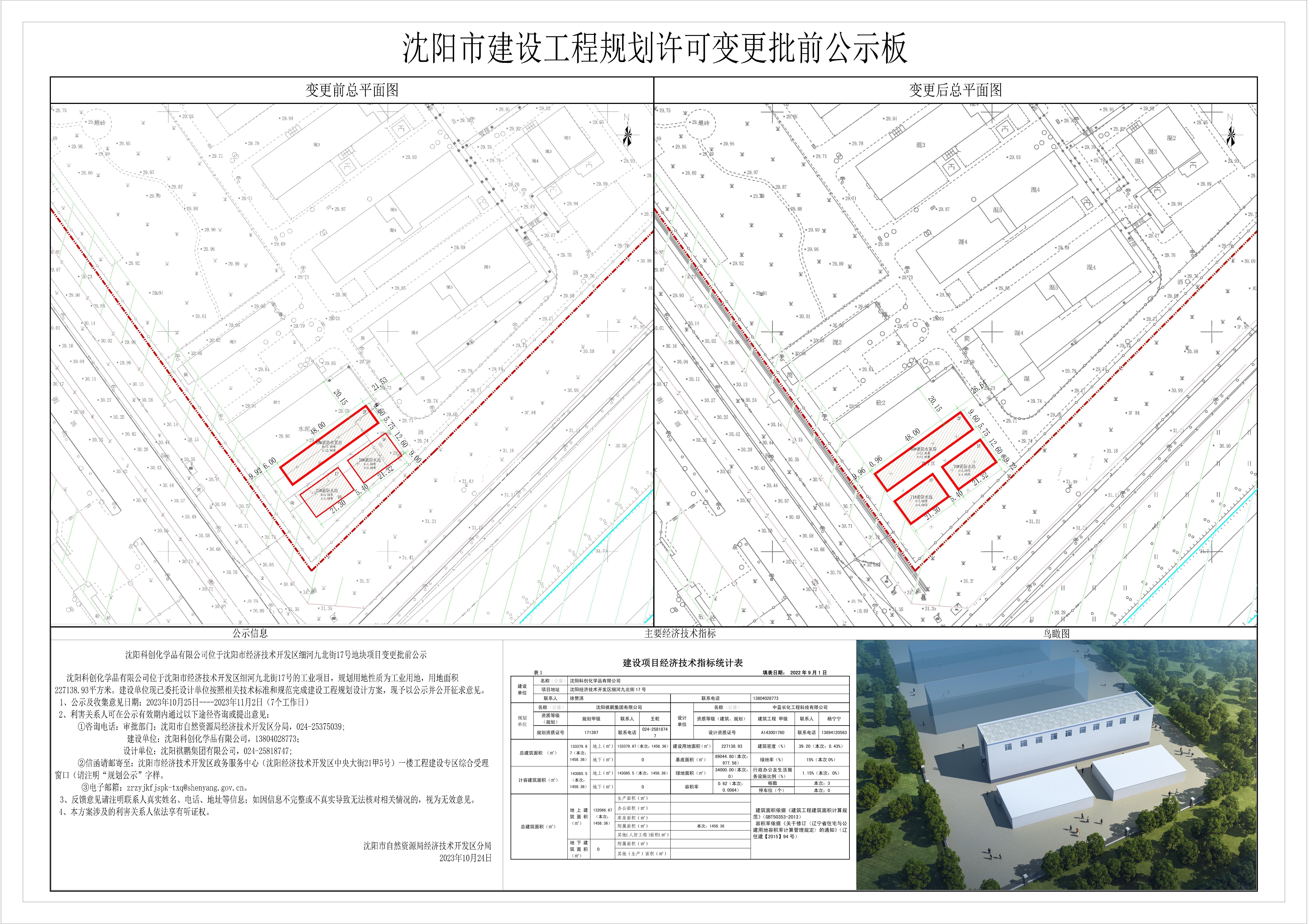 沈阳科创化学品有限公司位于沈阳经济技术开发区 细河九北街17号地块项目变更批前公示 沈阳科创化学品有限公司位于沈阳市经济技术开发区细河九北街17号的工业项目,规划用地性质为工业用地,用地面积227138.93平方米。建设单位现已委托设计单位按照相关技术标准和规范完成建设工程规划设计方案,现予以公示并公开征求意见。 1、公示及收集意见日期:2023年10月25日----2023年11月2日(7个工作日) 2、利害关系人可在公示有效期内通过以下途径咨询或提出意见: ①咨询电话:审批部门:沈阳市自然资源局经济技术开发区分局,024-25375039; 建设单位:沈阳科创化学品有限公司,13804028773; 设计单位:沈阳祺鹏集团有限公司,024-25818747; ②信函请邮寄至:沈阳市经济技术开发区政务服务中心(沈阳经济技术开发区中央大街21甲5号)一楼工程建设专区综合受理窗口(请注明“规划公示”字样。 ③电子邮箱:zrzyjkfjspk-txq@shenyang.gov.cn。 3、反馈意见请注明联系人真实姓名、电话、地址等信息;如因信息不完整或不真实导致无法核对相关情况的,视为无效意见。 4、本方案涉及的利害关系人依法享有听证权。