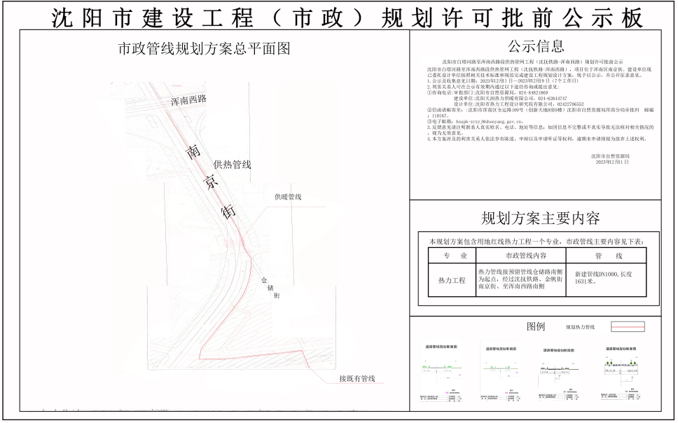 沈阳市白塔河路至浑南西路段供热管网工程(沈抚铁路-浑南西路),项目位于浑南区南京街。建设单位现已委托设计单位按照相关技术标准和规范完成建设工程规划设计方案,现予以公示,并公开征求意见。 1.公示及收集意见日期:2023年12月11日—2023年12月19日(7个工作日) 2.利害关系人可在公示有效期内通过以下途径咨询或提出意见: ①咨询电话:审批部门:沈阳市自然资源局,024-84821869 建设单位:沈阳天润热力供暖有限公司,024-62644747 设计单位:沈阳市热力工程设计研究院有限公司,02422706552 ②信函请邮寄至::沈阳市浑南区全运路109号(创新天地H座9楼)沈阳市自然资源局浑南分局审批科 邮编:110167。 ③电子邮箱:hnspk-zrzyj@shenyang.gov.cn。 3.反馈意见请注明联系人真实姓名、电话、地址等信息;如因信息不完整或不真实导致无法核对相关情况的,视为无效意见。 4.本方案涉及的利害关系人依法享有陈述、申辩以及申请听证等权利,逾期未申请则视为放弃上述权利。 沈阳市自然资源局 2023年12月11日