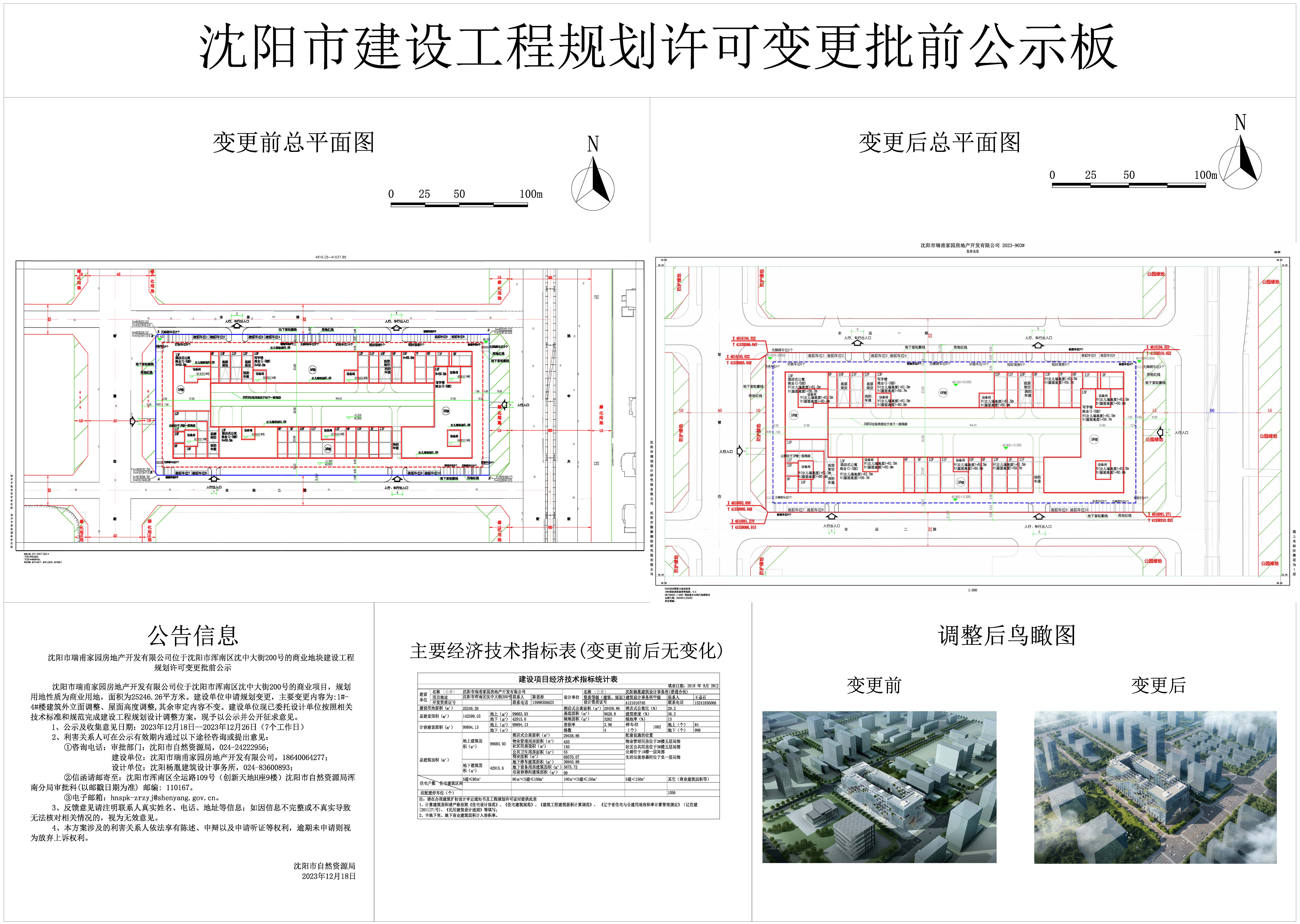 沈阳市瑞甫家园房地产开发有限公司位于沈阳市浑南区沈中大街200号的商业地块建设工程,规划用地性质为商业用地,面积为25246.26平方米。建设单位申请规划变更,主要变更内容为:1#-4#楼建筑外立面调整、屋面高度调整,其余审定内容不变。建设单位现已委托设计单位按照相关技术标准和规范完成建设工程规划设计调整方案,现予以公示并公开征求意见。 1、公示及收集意见日期:2023年12月18日--2023年12月26日(7个工作日) 2、利害关系人可在公示有效期内通过以下途径咨询或提出意见: ①咨询电话: 审批部门:沈阳市自然资源局,024-24222956; 建设单位:沈阳市瑞甫家园房地产开发有限公司,18640064277; 设计单位:沈阳杨胤建筑设计事务所 024-83600893; ②信函请邮寄至:沈阳市浑南区全运路109号(创新天地H座9楼)沈阳市自然资源局浑南分局审批科(以邮戳日期为准) 邮编: 110167。 ③电子邮箱:hnspk-zrzyj@shenyang.gov.cn。 3、反馈意见请注明联系人真实姓名、电话、地址等信息;如因信息不完整或不真实导致无法核对相关情况的,视为无效意见。 4、本方案涉及的利害关系人依法享有陈述、申辩以及申请听证等权利,逾期未申请则视为放弃上诉权利。