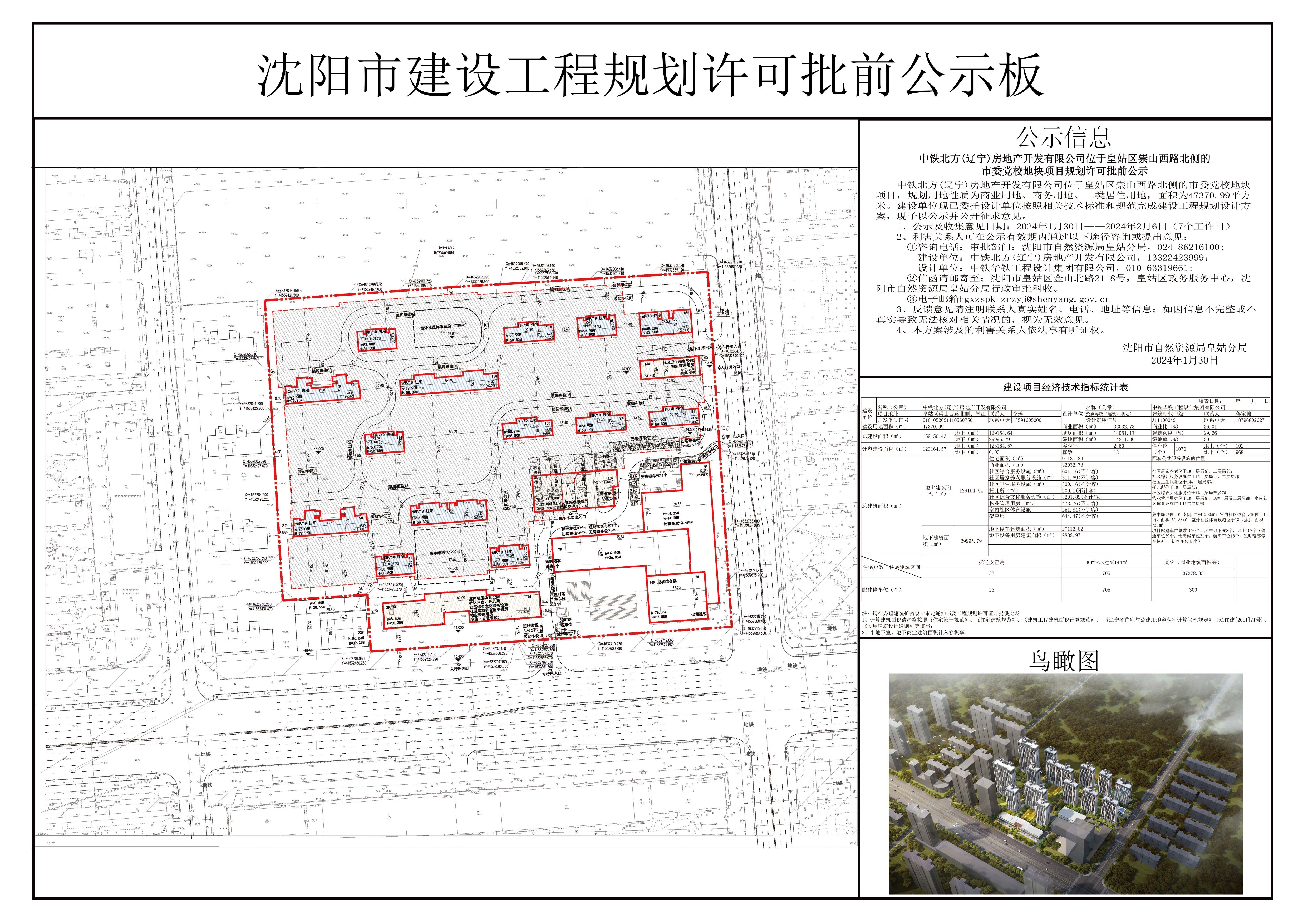 中铁北方(辽宁)房地产开发有限公司位于皇姑区崇山西路北侧的市委党校地块项目,规划用地性质为商业用地、商务用地、二类居住用地,面积为47370.99平方米。建设单位现已委托设计单位按照相关技术标准和规范完成建设工程规划设计方案,现予以公示并公开征求意见。 1、公示及收集意见日期:2024年1月30日——2024年2月6日(7个工作日) 2、利害关系人可在公示有效期内通过以下途径咨询或提出意见: ①咨询电话:审批部门:沈阳市自然资源局皇姑分局,024-86216100; 建设单位:中铁北方(辽宁)房地产开发有限公司,13322423999; 设计单位:中铁华铁工程设计集团有限公司,010-63319661; ②信函请邮寄至;沈阳市皇姑区金山北路21-8号,皇姑区政务服务中心,沈阳市自然资源局皇姑分局行政审批科收。 ③电子邮箱:hgxzspk-zrzyj@shenyang.gov.cn 3、反馈意见请注明联系人真实姓名、电话、地址等信息;如因信息不完整或不真实导致无法核对相关情况的,视为无效意见。 4、本方案涉及的利害关系人依法享有听证权。 沈阳市自然资源局皇姑分局 2024年1月30日
