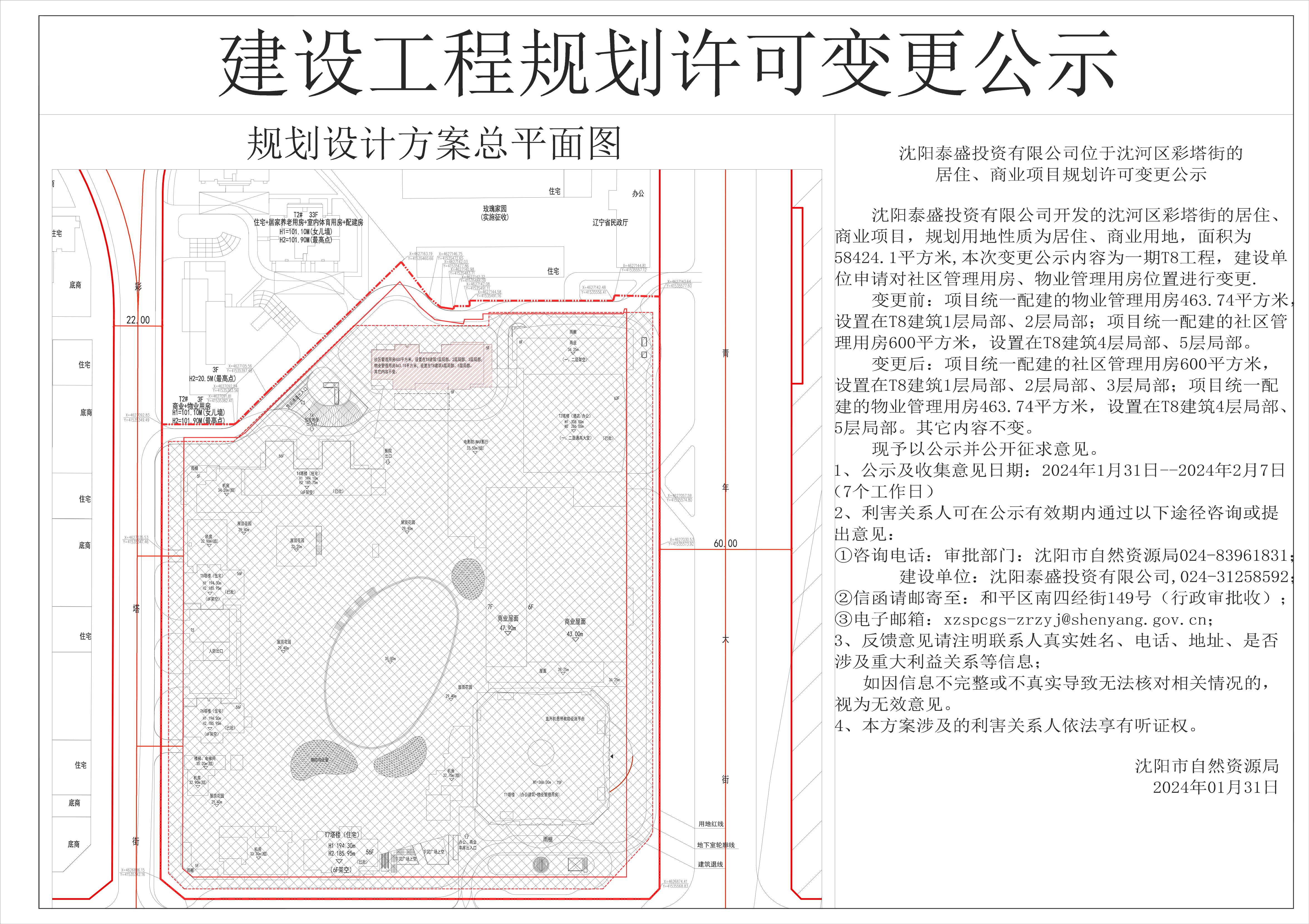 沈阳泰盛投资有限公司开发的沈河区彩塔街的居住、商业项目,规划用地性质为居住、商业用地,面积为58424.1平方米,本次变更公示内容为一期T8工程,建设单位申请对社区管理用房、物业管理用房位置进行变更. 变更前:项目统一配建的物业管理用房463.74平方米,设置在T8建筑1层局部、2层局部;项目统一配建的社区管理用房600平方米,设置在T8建筑4层局部、5层局部。 变更后:项目统一配建的社区管理用房600平方米,设置在T8建筑1层局部、2层局部、3层局部;项目统一配建的物业管理用房463.74平方米,设置在T8建筑4层局部、5层局部。其它内容不变。 现予以公示并公开征求意见。