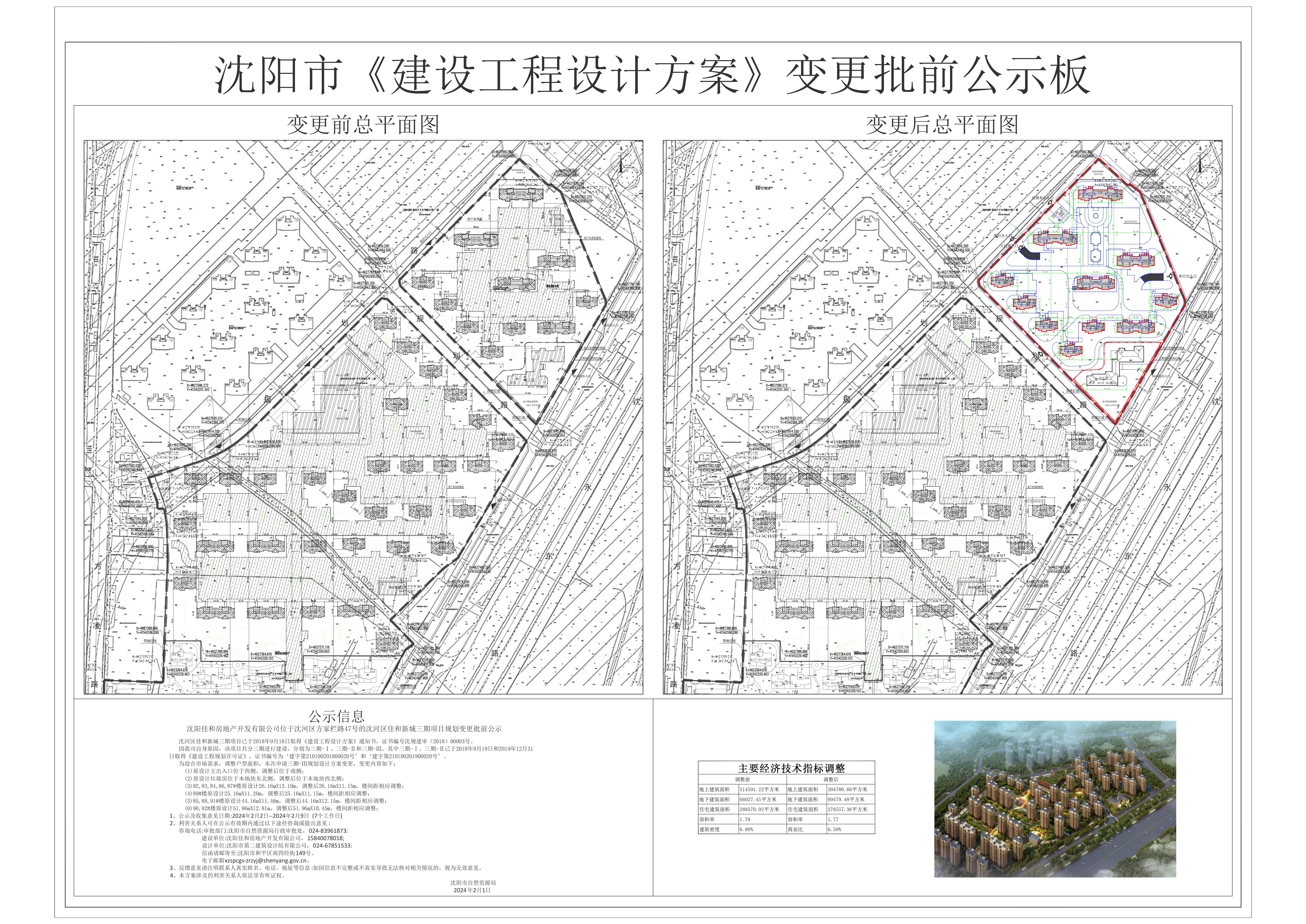 沈河区佳和新城三期项目已于2018年9月18日取得《建设工程设计方案》通知书,证书编号沈规建审(2018)00003号。该项目共分三期进行建设,分别为三期-Ⅰ、三期-Ⅱ和三期-Ⅲ。其中三期-Ⅰ、三期-Ⅱ已于2018年9月18日和2019年12月31日取得《建设工程规划许可证》,证书编号为‘建字第210100201800020号’和‘建字第210100201900020号’。为迎合市场需求,调整户型面积,本次申请三期-Ⅲ规划设计方案变更,变更内容如下: (1)原设计主出入口位于西侧,调整后位于南侧; (2)原设计垃圾房位于本地块东北侧,调整后位于本地块西北侧; (3)82,83,84,86,87#楼原设计26.16mX13.10m,调整后26.16mX11.15m,楼间距相应调整; (4)89#楼原设计25.16mX11.20m,调整后25.16mX11.15m,楼间距相应调整; (5)85,88,91#楼原设计44.16mX11.46m,调整后44.16mX12.15m,楼间距相应调整; (6)90,92#楼原设计51.96mX12.81m,调整后51.96mX10.45m,楼间距相应调整; 1、公示及收集意见日期:2024年2月2日--2024年2月9日 (7个工作日) 设计单位:沈阳市第二建筑设计院有限公司,024-67851533: 信函请邮寄至:沈阳市和平区南四经街149号。 电子邮箱:xzspcgs-zrzyj@shenyang.gov.cn