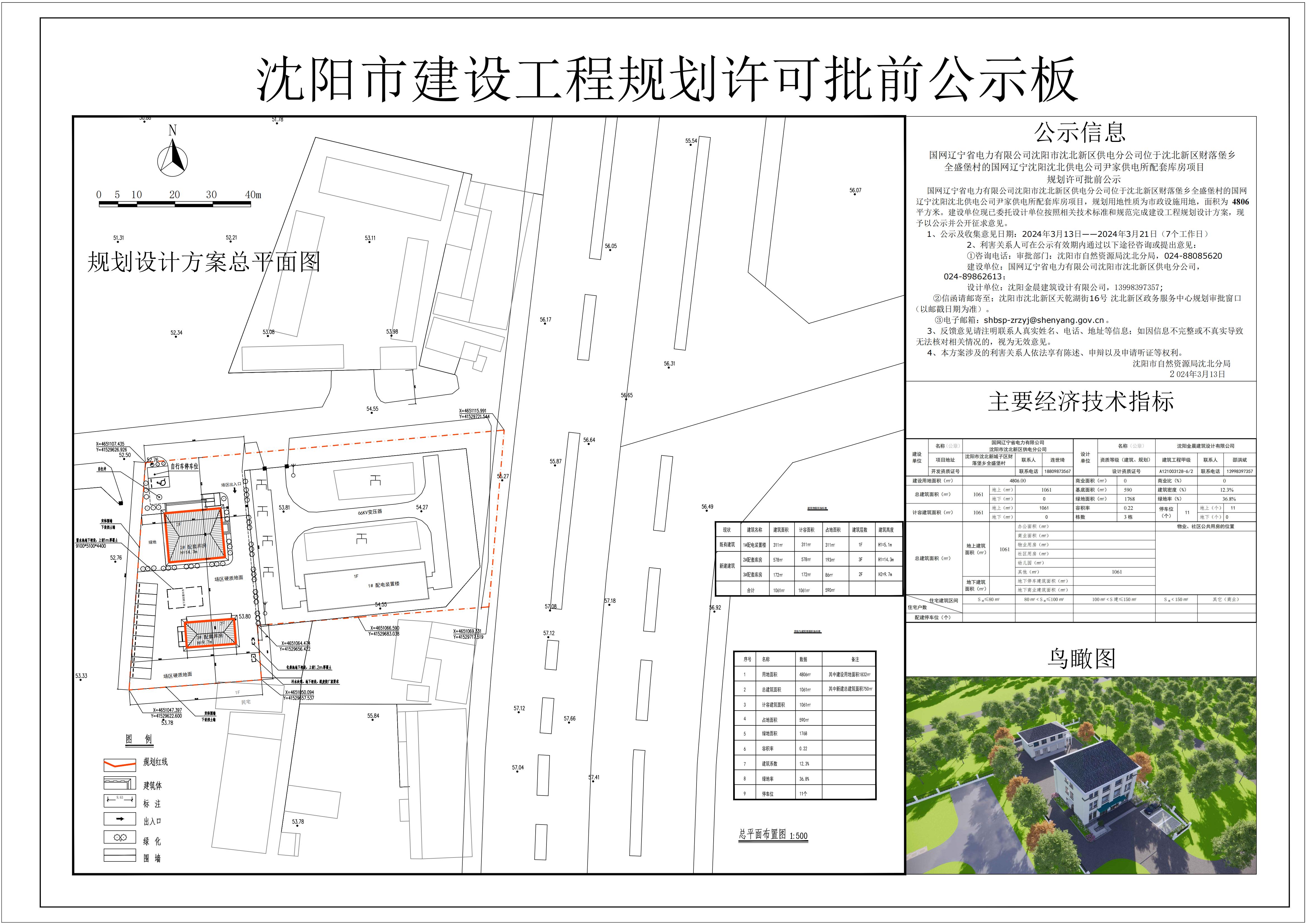 国网辽宁省电力有限公司沈阳市沈北新区供电分公司位于沈北新区财落堡乡全盛堡村的国网辽宁沈阳沈北供电公司尹家供电所配套库房项目,规划用地性质为市政设施用地,面积为4806平方米。建设单位现已委托设计单位按照相关技术标准和规范完成建设工程规划设计方案,现予以公示并公开征求意见。 1、公示及收集意见日期:2024年3月13日——2024年3月21日(7个工作日) 2、利害关系人可在公示有效期内通过以下途径咨询或提出意见: ①咨询电话:审批部门:沈阳市自然资源局沈北分局,024-88085620; 建设单位:国网辽宁省电力有限公司沈阳市沈北新区供电分公司,024-89862613; 设计单位:沈阳金晨建筑设计有限公司,024-13998397357; ②信函请邮寄至;沈阳市沈北新区天乾湖街16号,沈北新区政务服务中心规划审批窗口(以邮戳日期为准)。 ③电子邮箱:shbsp-zrzyj@shenyang.gov.cn 3、反馈意见请注明联系人真实姓名、电话、地址等信息;如因信息不完整或不真实导致无法核对相关情况的,视为无效意见。 4、本方案涉及的利害关系人依法享有陈述、申辩以及申请听证等权利。 沈阳市自然资源局沈北分局 2024年3月13日