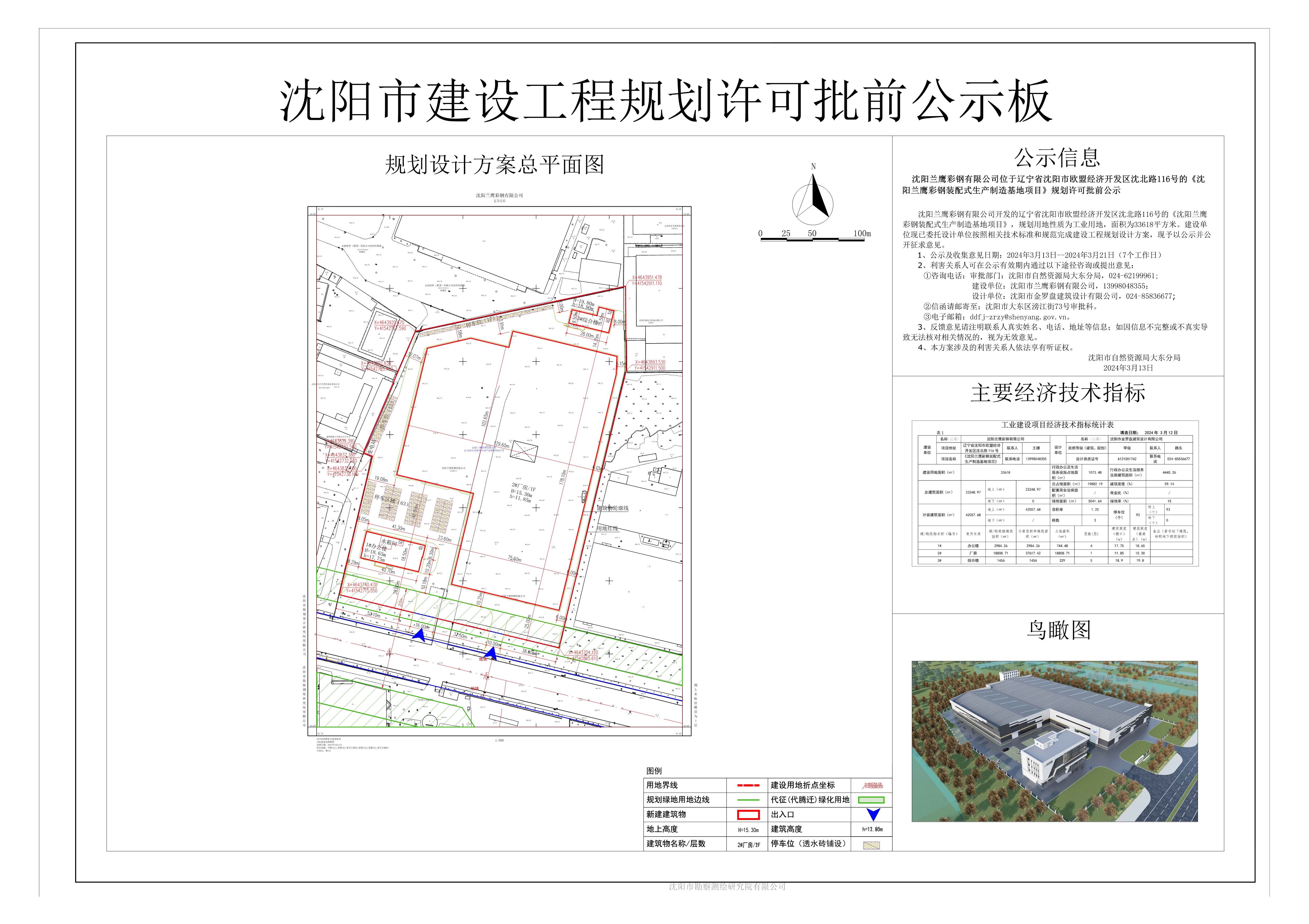沈阳兰鹰彩钢有限公司位于辽宁省沈阳市欧盟经济开发区沈北路116号的《沈阳兰鹰彩钢装配式生产制造基地项目》规划许可批前公示