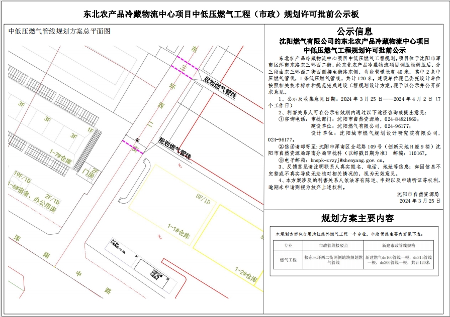 沈阳燃气有限公司的东北农产品冷藏物流中心项目中低压燃气工程规划许可批前公示