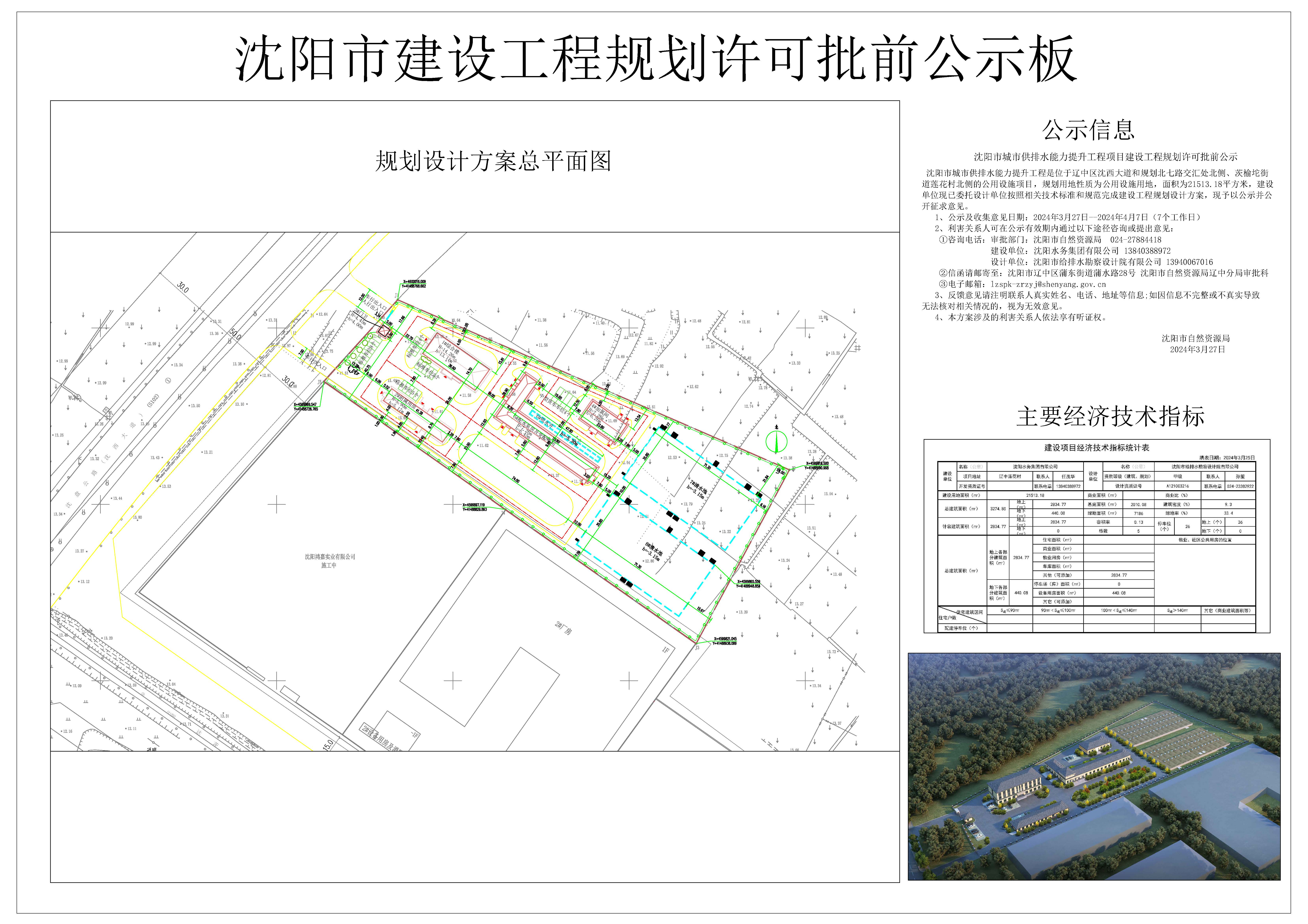 沈阳市城市供排水能力提升工程是位于辽中区沈西大道和规划北七路交汇处北侧、茨榆坨街道莲花村北侧的公用设施项目,规划用地性质为公用设施用地,面积为21513.18平方米,建设单位现已委托设计单位按照相关技术标准和规范完成建设工程规划设计方案,现予以公示并公开征求意见。 1、公示及收集意见日期:2024年3月27日——2024年4月7日(7个工作日) 2、利害关系人可在公示有效期内通过以下途径咨询或提出意见: ①咨询电话:审批部门:沈阳市自然资源局,024-27884418 建设单位:沈阳水务集团有限公司,13840388972 设计单位:沈阳市给排水勘察设计院有限公司,13940067016 ②信函请邮寄至:沈阳市辽中区蒲东街道蒲水路28号,沈阳市自然资源局辽中分局审批科。 ③电子邮箱:lzspk-zrzyj@shenyang.gov.cn 3、反馈意见请注明联系人真实姓名、电话、地址等信息;如因信息不完整或不真实导致无法核对相关情况的,视为无效意见。 4、本方案涉及的利害关系人依法享有听证权。 沈阳市自然资源局 2024年3月27日