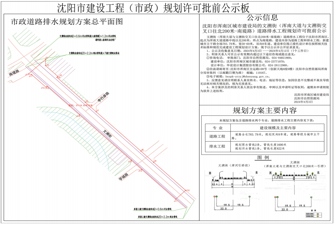 沈阳市浑南区城市建设局的文溯街(浑南大道与文溯街交叉口往北200米-南堤路)道路排水工程规划许可批前公示
