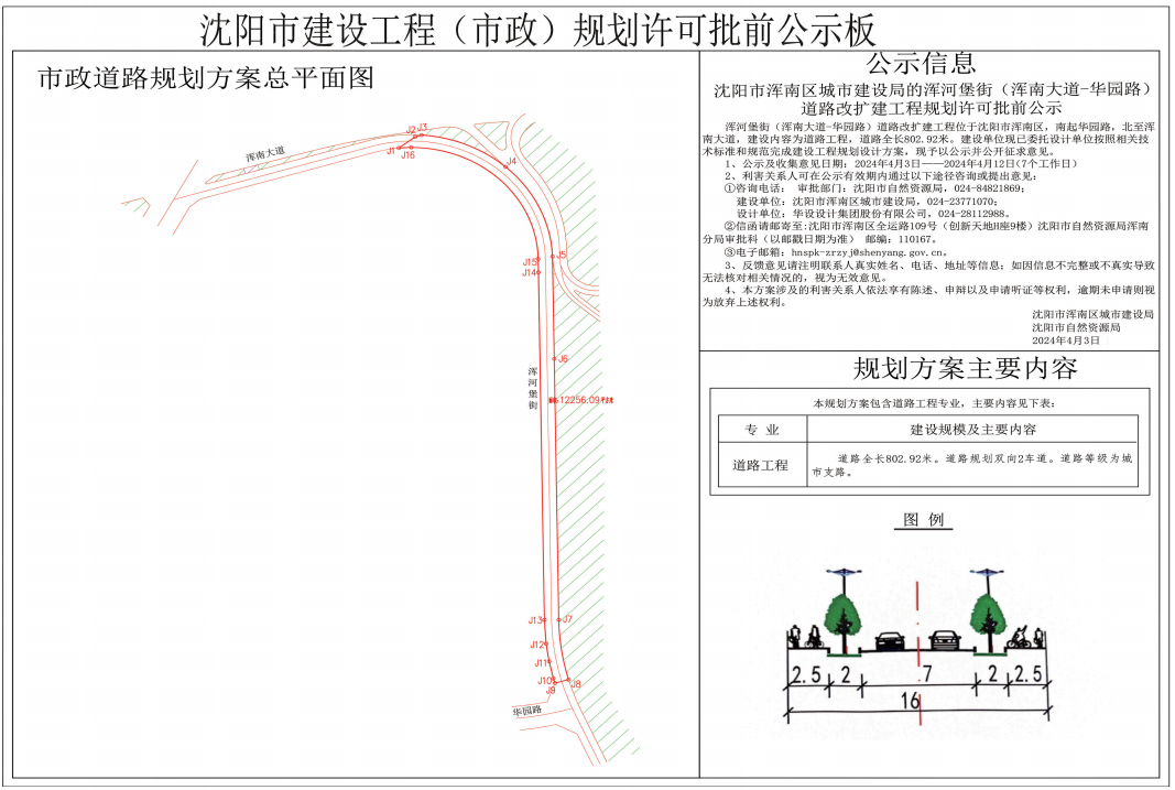 浑河堡街(浑南大道-华园路)道路改扩建工程位于沈阳市浑南区,南起华园路,北至浑南大道,建设内容为道路工程,道路全长802.92米。建设单位现已委托设计单位按照相关技术标准和规范完成建设工程规划设计方案,现予以公示并公开征求意见。 1、公示及收集意见日期:2024年4月3日——2024年4月12日(7个工作日) 2、利害关系人可在公示有效期内通过以下途径咨询或提出意见: ①咨询电话:审批部门:沈阳市自然资源局,024-84821869; 建设单位:沈阳市浑南区城市建设局,024-23771070; 设计单位:华设设计集团股份有限公司,024-28112988。 ②信函请邮寄至:沈阳市浑南区全运路109号(创新天地H座9楼)沈阳市自然资源局浑南分局审批科(以邮戳日期为准),邮编:110167。 ③电子邮箱:hnspk-zrzyj@shenyang.gov.cn 3、反馈意见请注明联系人真实姓名、电话、地址等信息;如因信息不完整或不真实导致无法核对相关情况的,视为无效意见。 4、本方案涉及的利害关系人依法享有陈述、申辩以及申请听证等权利,逾期未申请则视为放弃上述权利。 沈阳市浑南区城市建设局 沈阳市自然资源局 2024年4月3日