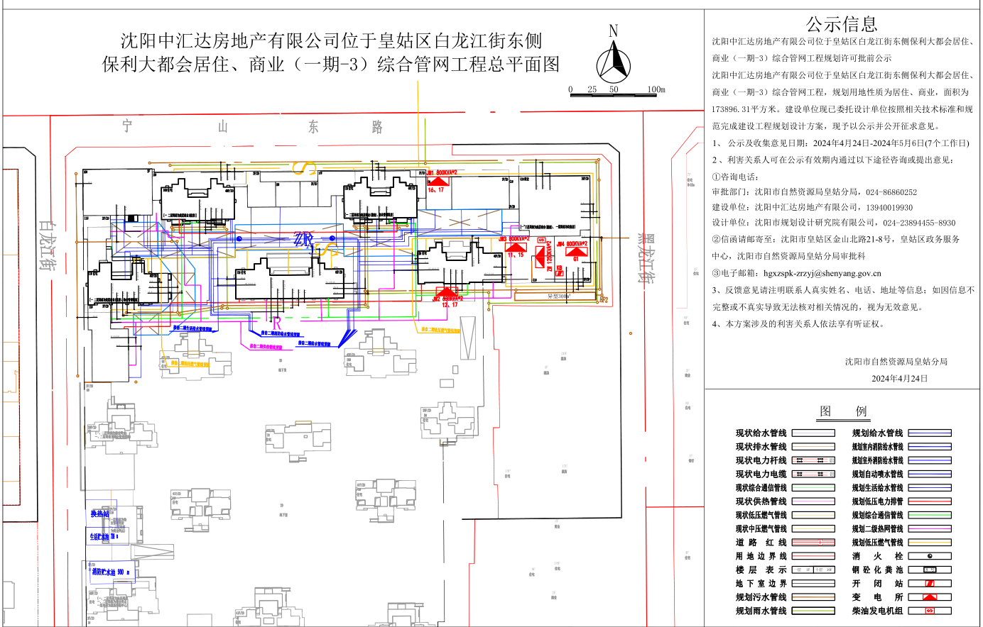 沈阳中汇达房地产有限公司位于皇姑区白龙江街东侧保利大都会居住、商业(一期-3)综合管网工程,规划用地性质为居住、商业,面积为173896.31平方米。建设单位现已委托设计单位按照相关技术标准和规范完成建设工程规划设计方案,现予以公示并公开征求意见。 1、公示及收集意见日期:2024年4月24日----2024年5月6日(7个工作日) 2、利害关系人可在公示有效期内通过以下途径咨询或提出意见: ①咨询电话: 审批部门:沈阳市自然资源局皇姑分局,024-86860252; 建设单位:沈阳中汇达房地产有限公司,024-23412111; 设计单位:沈阳市规划设计研究院有限公司,024-23931269; ②信函请邮寄至:沈阳市皇姑区金山北路21-8号,皇姑区政务服务中心,沈阳市自然资源局皇姑分局审批科。 ③电子邮箱:hgxzspk-zrzyj@shenyang.gov.cn 3、反馈意见请注明联系人真实姓名、电话、地址等信息;如因信息不完整或不真实导致无法核对相关情况的,视为无效意见。 4、本方案涉及的利害关系人依法享有听证权。 沈阳市自然资源局皇姑分局 2024年4月24日
