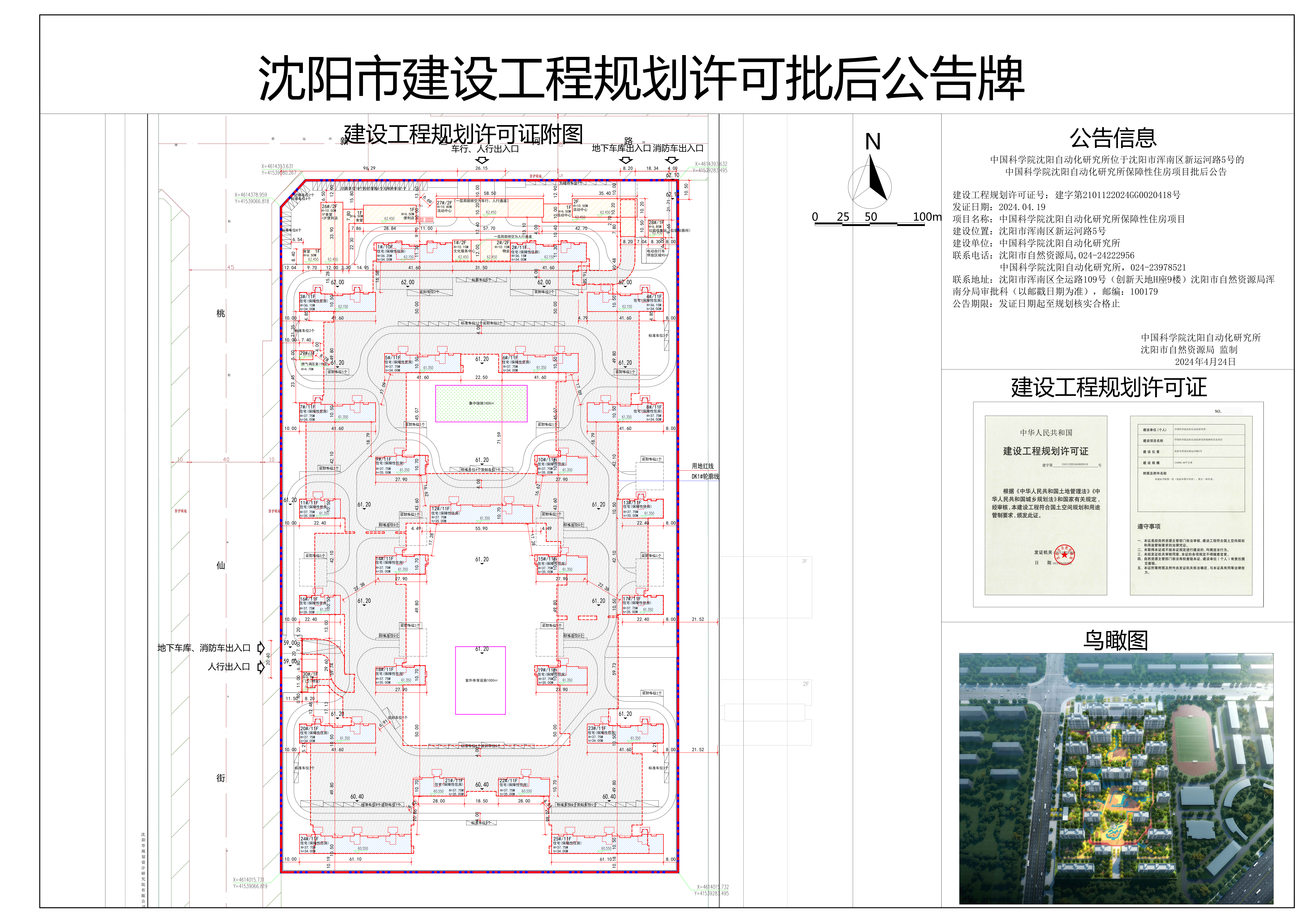 建设工程规划许可证号:建字第2101122024GG0020418号 发证日期:2024.04.19 项目名称:中国科学院沈阳自动化研究所保障性住房项目 建设位置:沈阳市浑南区新运河路5号 建设单位:中国科学院沈阳自动化研究所 联系电话:沈阳市自然资源局,024-24222956 中国科学院沈阳自动化研究所,024-23978521 联系地址:沈阳市浑南区全运路109号(创新天地H座9楼)沈阳市自然资源局浑 南分局审批科(以邮戳日期为准),邮编:100179 公告期限:发证日期起至规划核实合格止 中国科学院沈阳自动化研究所 沈阳市自然资源局 监制 2024年4月24日