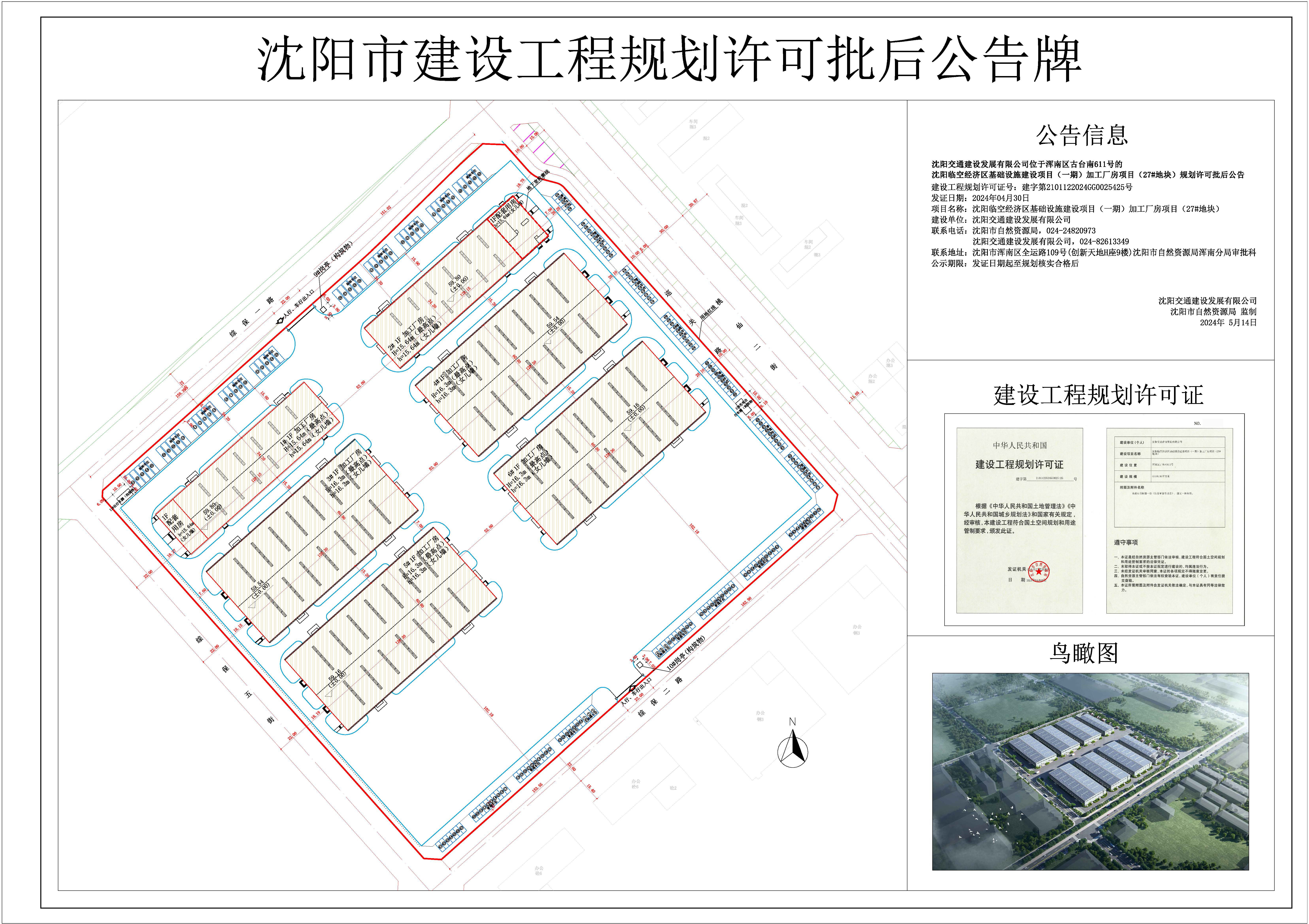 建设工程规划许可证号:建字第2101122024GG0025425号 发证日期:2024年04月30日 项目名称:沈阳临空经济区基础设施建设项目(一期)加工厂房项目(27#地块) 建设单位:沈阳交通建设发展有限公司 联系电话:沈阳市自然资源局,024-24820973 沈阳交通建设发展有限公司,024-82613349 联系地址:沈阳市浑南区全运路109号(创新天地H座9楼)沈阳市自然资源局浑南分局审批科 公示期限:发证日期起至规划核实合格后 沈阳交通建设发展有限公司 沈阳市自然资源局 监制 2024年5月14日