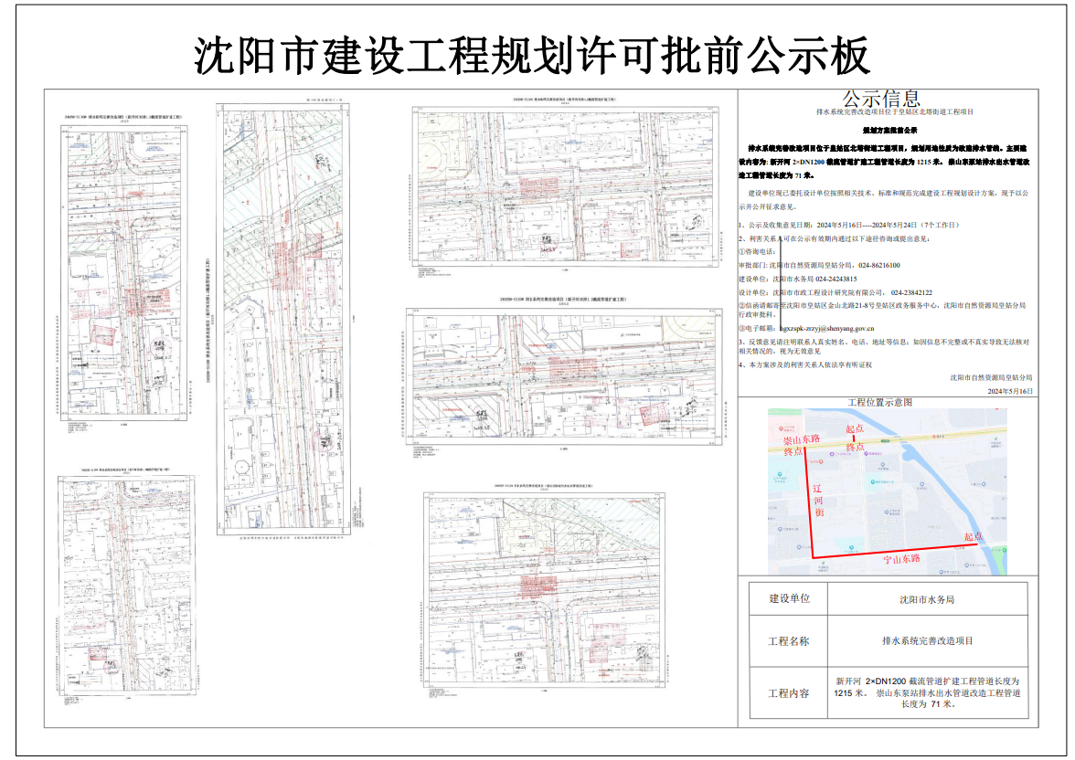 排水系统完善改造项目位于皇姑区北塔街道工程项目,规划用地性质为改建排水管线。主要建设内容为: 新开河2×DN1200 截流管道扩建工程管道长度为1215 米。崇山东泵站排水出水管道改造工程管道长度为71 米。 建设单位现已委托设计单位按照相关技术、标准和规范完成建设工程规划设计方案,现予以公示并公开征求意见。 1、公示及收集意见日期:2024年5月16日——2024年5月24日(7个工作日) 2、利害关系人可在公示有效期内通过以下途径咨询或提出意见: ①咨询电话: 审批部门: 沈阳市自然资源局皇姑分局,024-86216100 建设单位:沈阳市水务局,024-24243815 设计单位:沈阳市市政工程设计研究院有限公司, 024-23842122 ②信函请邮寄至沈阳市皇姑区金山北路21-8号皇姑区政务服务中心,沈阳市自然资源局皇姑分局行政审批科。 ③电子邮箱:hgxzspk-zrzyj@shenyang.gov.cn 3、反馈意见请注明联系人真实姓名、电话、地址等信息;如因信息不完整或不真实导致无法核对相关情况的,视为无效意见。 4、本方案涉及的利害关系人依法享有听证权。 沈阳市自然资源局皇姑分局 2024年5月16日