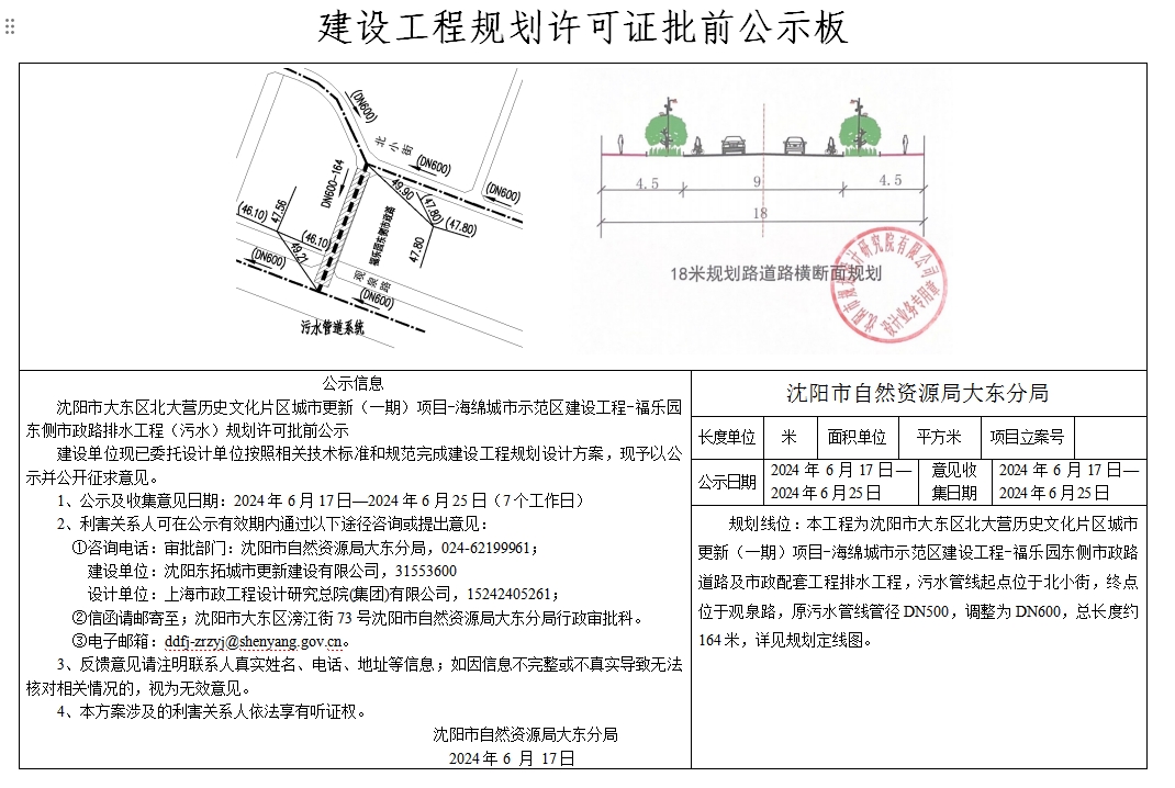 沈阳市大东区北大营历史文化片区城市更新(一期)项目-海绵城市示范区建设工程-福乐园东侧市政路排水工程(污水)规划许可批前公示