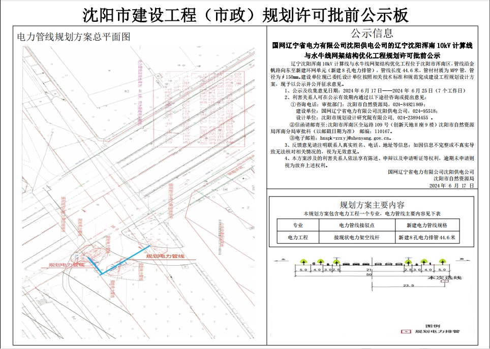 辽宁沈阳浑南10kV计算线与水牛线网架结构优化工程位于沈阳市浑南区,管线沿金帆路向东至新建环网单元(新建8孔电力排管),管线长度44.6米,管材材质为MPP管,管径为∮150mm。建设单位现已委托设计单位按照相关技术标准和规范完成建设工程规划设计方案,现予以公示并公开征求意见。 1、公示及收集意见日期:2024年6月17日——2024年6月25日(7个工作日) 2、利害关系人可在公示有效期内通过以下途径咨询或提出意见: ①咨询电话: 审批部门:沈阳市自然资源局,024-84821869; 建设单位:国网辽宁省电力有限公司沈阳供电公司,024-95518; 设计单位:沈阳市规划设计研究院有限公司,024-23894455。 ②信函请邮寄至:沈阳市浑南区全运路109号(创新天地H座9楼)沈阳市自然资源局浑南分局审批科(以邮戳日期为准),邮编:110167。 ③电子邮箱:hnspk-zrzyj@shenyang.gov.cn 3、反馈意见请注明联系人真实姓名、电话、地址等信息;如因信息不完整或不真实导致无法核对相关情况的,视为无效意见。 4、本方案涉及的利害关系人依法享有陈述、申辩以及申请听证等权利,逾期未申请则视为放弃上述权利。 国网辽宁省电力有限公司沈阳供电公司 沈阳市自然资源局 2024年6月17日