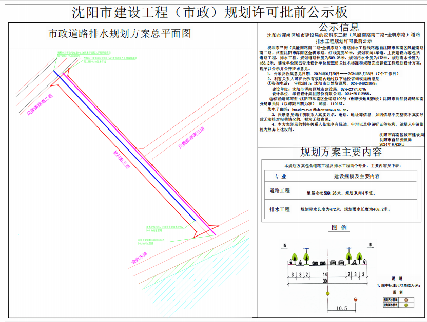 祝科东三街(风能南路南二路-金帆东路)道路排水工程线路起自沈阳市浑南区风能南路南二路,终至沈阳市浑南区金帆东路,红线宽度30米,规划双向4车道。主要建设内容包括道路工程、排水工程,规划道路长度为509.26米,规划污水长度为472米,规划雨水长度为468.2米;建设单位现已委托设计单位按照相关技术标准和规范完成建设工程规划设计方案,现予以公示并公开征求意见。 1、公示及收集意见日期:2024年6月20日——2024年6月28日(7个工作日) 2、利害关系人可在公示有效期内通过以下途径咨询或提出意见: ①咨询电话: 审批部门:沈阳市自然资源局,024-84821869; 建设单位:沈阳市浑南区城市建设局,024-23771070; 设计单位:华设设计集团股份有限公司,024-28112988。 ②信函请邮寄至:沈阳市浑南区全运路109号(创新天地H座9楼)沈阳市自然资源局浑南分局审批科(以邮戳日期为准),邮编:110167。 ③电子邮箱:hnspk-zrzyj@shenyang.gov.cn 3、反馈意见请注明联系人真实姓名、电话、地址等信息;如因信息不完整或不真实导致无法核对相关情况的,视为无效意见。 4、本方案涉及的利害关系人依法享有陈述、申辩以及申请听证等权利,逾期未申请则视为放弃上述权利。 沈阳市浑南区城市建设局 沈阳市自然资源局 2024年6月20日