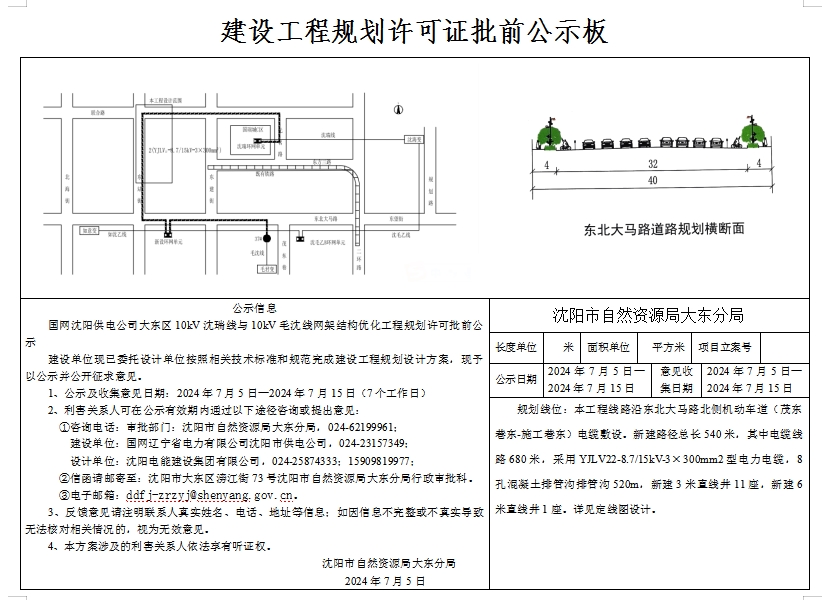 建设单位现已委托设计单位按照相关技术标准和规范完成建设工程规划设计方案,现予以公示并公开征求意见。 1、公示及收集意见日期:2024年7月5日—2024年7月15日(7个工作日) 2、利害关系人可在公示有效期内通过以下途径咨询或提出意见: ①咨询电话: 审批部门:沈阳市自然资源局大东分局,024-62199961; 建设单位:国网辽宁省电力有限公司沈阳市供电公司,024-23157349; 设计单位:沈阳电能建设集团有限公司,024-25874333;15909819977; ②信函请邮寄至:沈阳市大东区滂江街73号沈阳市自然资源局大东分局行政审批科。 ③电子邮箱:ddfj-zrzyj@shenyang.gov.cn 3、反馈意见请注明联系人真实姓名、电话、地址等信息;如因信息不完整或不真实导致无法核对相关情况的,视为无效意见。 4、本方案涉及的利害关系人依法享有听证权。 沈阳市自然资源局大东分局 2024年7月5日