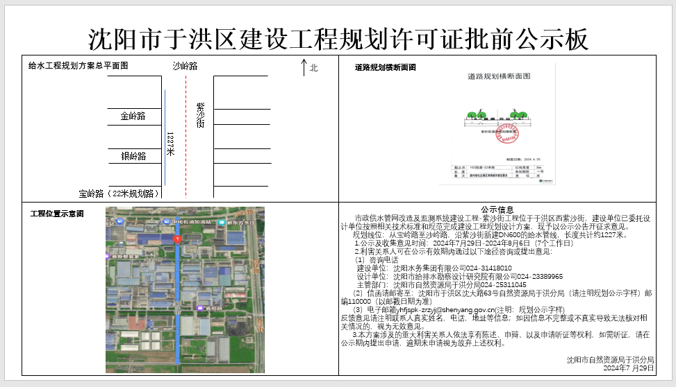 市政供水管网改造及监测系统建设工程-紫沙街工程位于于洪区西紫沙街,建设单位已委托设计单位按照相关技术标准和规范完成建设工程规划设计方案,现予以公示公告开征求意见。 规划线位:从宝岭路至沙岭路,沿紫沙街新建DN600的给水管线,长度共计约1227米。 1.公示及收集意见时间:2024年7月29日-2024年8月6日(7个工作日) 2.利害关系人可在公示有效期内通过以下途径咨询或提出意见: (1)咨询电话 建设单位:沈阳水务集团有限公司,024-31418010 设计单位:沈阳市给排水勘察设计研究院有限公司,024-23389965 主管部门:沈阳市自然资源局于洪分局,024-25311045 (2)信函请邮寄至:沈阳市于洪区沈大路63号自然资源局于洪分局(请注明规划公示字样)邮编110000(以邮戳日期为准) (3)电子邮箱:yhfjspk-zrzyj@shenyang.gov.cn(注明:规划公示字样) 反馈意见请注明联系人真实姓名,电话,地址等信息;如因信息不完整或不真实导致无法核对相关情况的,视为无效意见。 3.本方案涉及的重大利害关系人依法享有陈述、申辩、以及申请听证等权利,如需听证,请在公示期内提出申请,逾期未申请视为放弃上述权利。 沈阳市自然资源局于洪分局 2024年7月29日