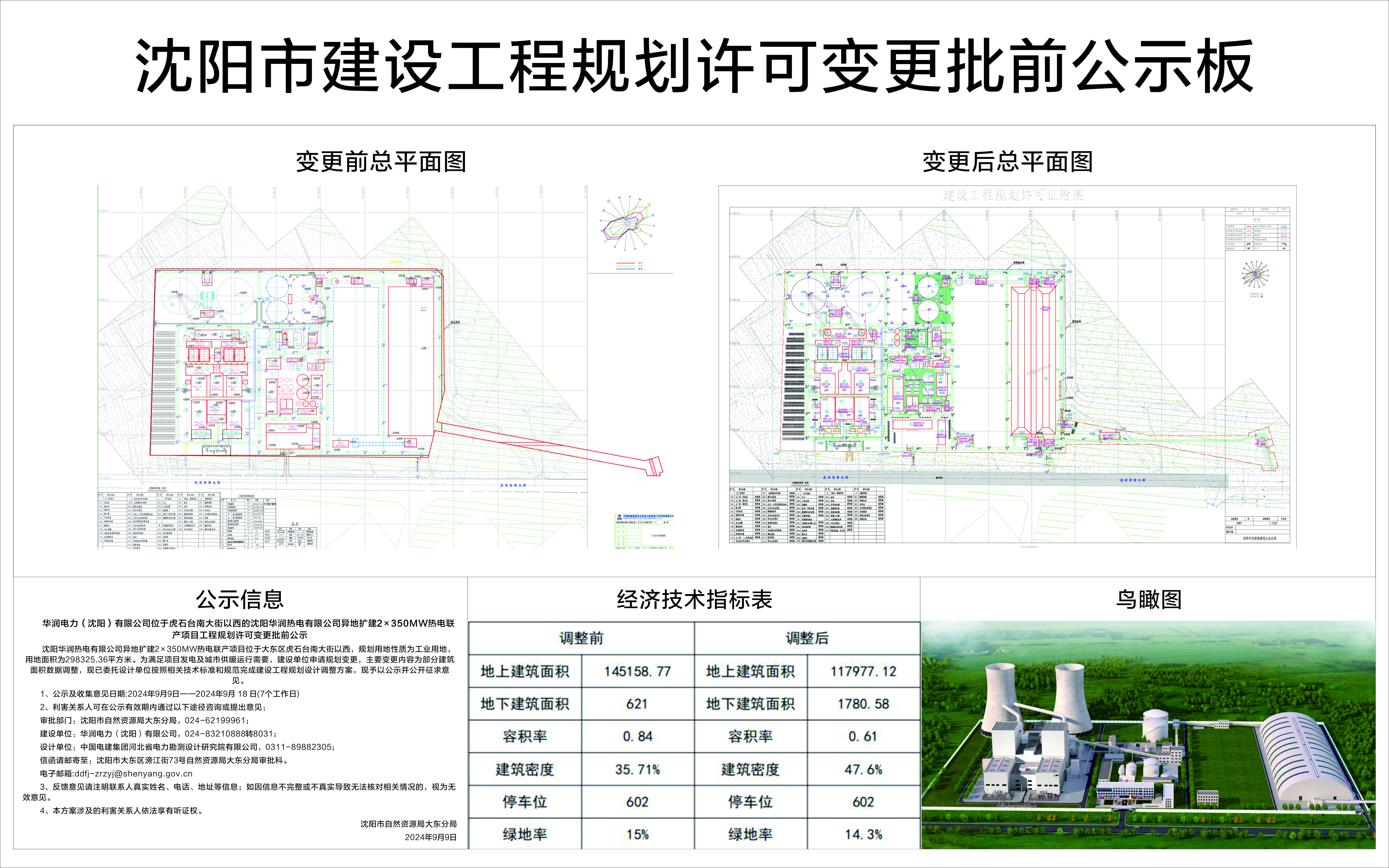 沈阳华润热电有限公司异地扩建2×350MW热电联产项目位于大东区虎石台南大街以西,规划用地性质为工业用地,用地面积为298325.36平方米。为满足项目发电及城市供暖运行需要,建设单位申请规划变更,主要变更内容为部分建筑面积数据调整,现已委托设计单位按照相关技术标准和规范完成建设工程规划设计调整方案,现予以公示并公开征求意见。 1.公示及收集意见日期:2024年9月9日——2024年9月18日(7个工作日) 2.利害关系人可在公示有效期内通过以下途径咨询或提出意见: 审批部门:沈阳市自然资源局大东分,024-62199961; 建设单位:华润电力(沈阳)有限公司,024-83210888转8031; 设计单位:中国电建集团河北省电力勘测设计研究院有限公司,0311-89882305; 信函请邮寄至:沈阳市大东区滂江街73号自然资源局大东分局审批科。 电子邮箱:ddfj-zrzyj@shenyang.gov.cn 3.反馈意见请注明联系人真实姓名、电话、地址等信息;如因信息不完整或不真实导致无法核对相关情况的,视为无效意见。 4.本方案涉及的利害关系人依法享有听证权。 沈阳市自然资源局大东分局 2024年9月9日