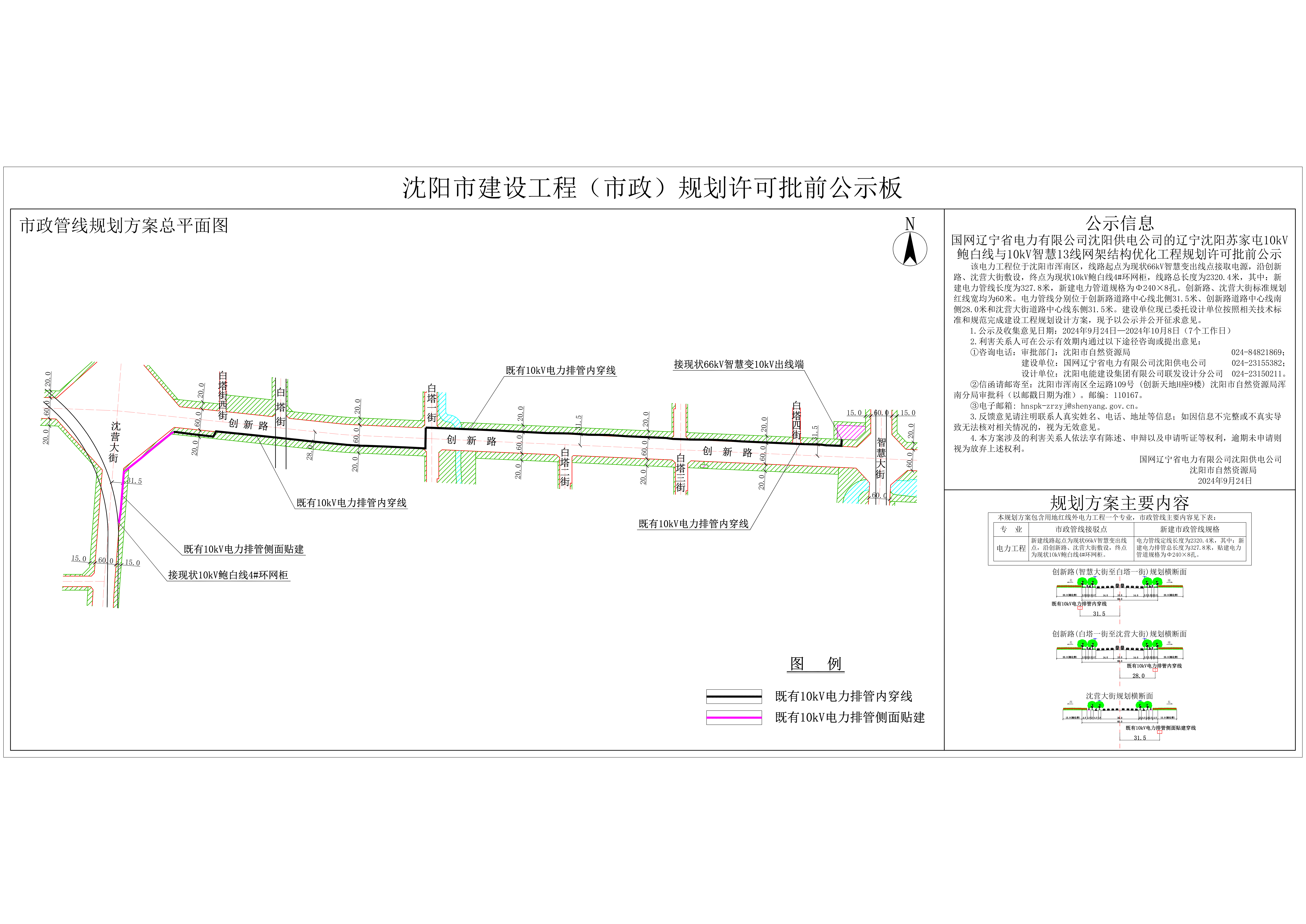该电力工程位于沈阳市浑南区,线路起点为现状66kV智慧变出线点接取电源,沿创新路、沈营大街敷设,终点为现状10kV鲍白线4#环网柜,线路总长度为2320.4米,其中:新建电力管线长度为327.8米,新建电力管道规格为Φ240×8孔。创新路、沈营大街标准规划红线宽均为60米。电力管线分别位于创新路道路中心线北侧31.5米、创新路道路中心线南侧28.0米和沈营大街道路中心线东侧31.5米。建设单位现已委托设计单位按照相关技术标准和规范完成建设工程规划设计方案,现予以公示并公开征求意见。 1、公示及收集意见日期:2024年9月24日——2024年10月8日(7个工作日) 2、利害关系人可在公示有效期内通过以下途径咨询或提出意见: ①咨询电话: 审批部门:沈阳市自然资源局,024-84821869; 建设单位:国网辽宁省电力有限公司沈阳供电公司,024-23155382; 设计单位:沈阳电能建设集团有限公司联发设计分公司,024-23150211。 ②信函请邮寄至:沈阳市浑南区全运路109号(创新天地H座9楼)沈阳市自然资源局浑南分局审批科(以邮戳日期为准)邮编:110167。 ③电子邮箱:hnspk-zrzyj@shenyang.gov.cn 3、反馈意见请注明联系人真实姓名、电话、地址等信息;如因信息不完整或不真实导致无法核对相关情况的,视为无效意见。 4、本方案涉及的利害关系人依法享有陈述、申辩以及申请听证等权利,逾期未申请则视为放弃上述权利。 国网辽宁省电力有限公司沈阳供电公司 沈阳市自然资源局 2024年9月24日