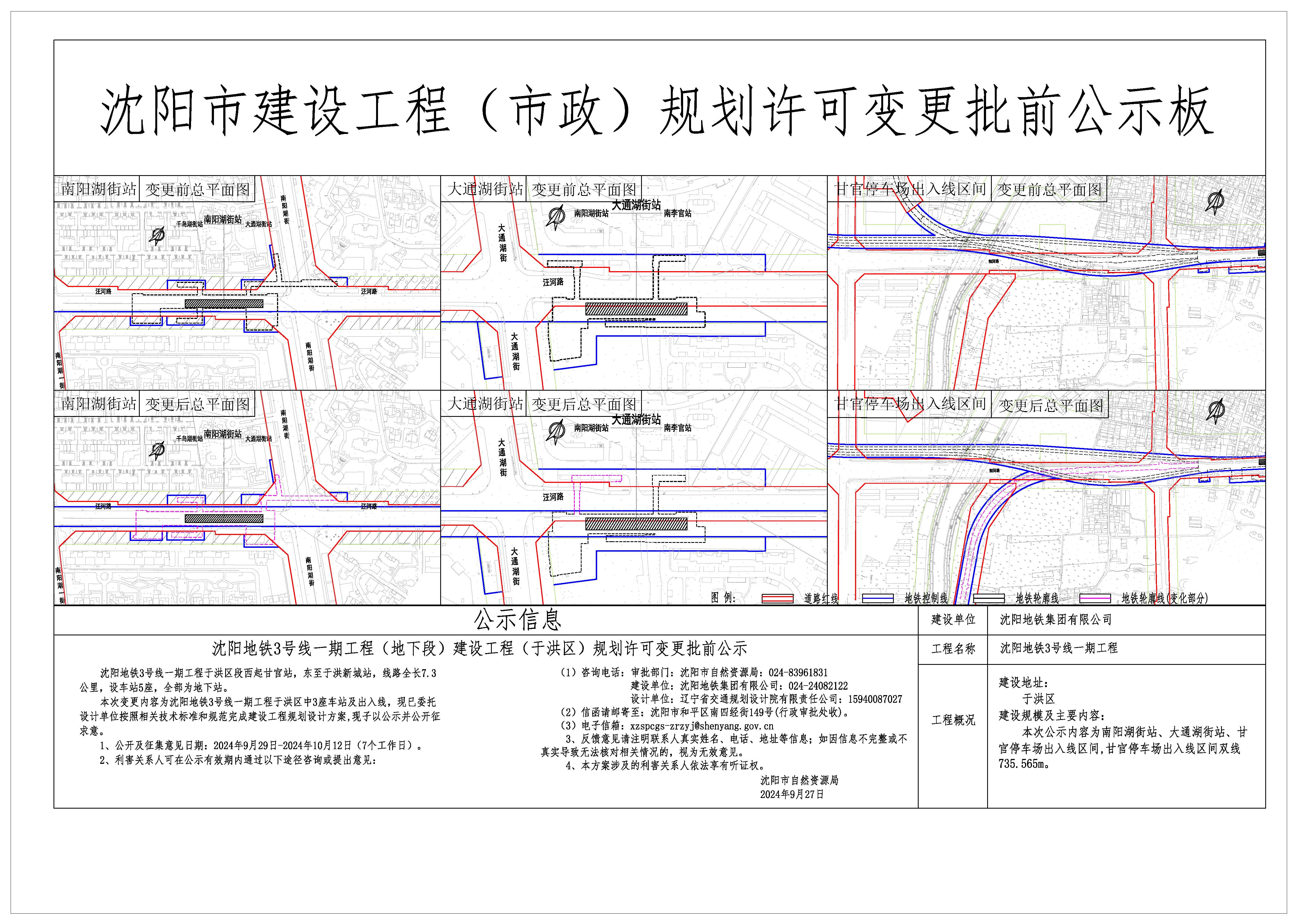 沈阳地铁3号线一期工程于洪区段西起甘官站,东至于洪新城站,线路全长7.3公里,设车站5座,全部为地下站。 本次变更内容为沈阳地铁3号线一期工程于洪区中3座车站及出入线,现已委托设计单位按照相关技术标准和规范完成建设工程规划设计方案,现予以公示并公开征求意。 1、公开及征集意见日期:2024年9月29日-2024年10月12日(7个工作日)。 2、利害关系人可在公示有效期内通过以下途径咨询或提出意见: (1)咨询电话:审批部门:沈阳市自然资源局:024-83961831 建设单位:沈阳地铁集团有限公司:024-24082122 设计单位:中国铁路设计集团有限公司:13612188068 辽宁省交通规划设计院有限责任公司:15940087027 (2)信函请邮寄至:沈阳市和平区南四经街149号(行政审批处收)。 (3)电子信箱:xzspcgs-zrzyj@shenyang.gov.cn 3、反馈意见请注明联系人真实姓名、电话、地址等信息;如因信息不完整或不真实导致无法核对相关情况的,视为无效意见。 4、本方案涉及的利害关系人依法享有听证权。 沈阳市自然资源局 2024年9月27日