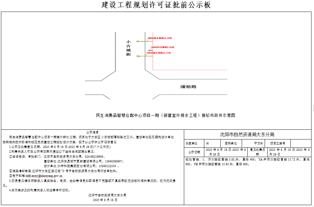 民生消费品智慧仓配中心项目一期室外排水工程,项目位于大东区小古城街蒲裕路交叉口。建设单位现已委托设计单位按照相关技术标准和规范完成建设工程规划设计方案,现予以公示并公开征求意见 1.公示及收集意见日期:2025年8月18日-2025年8月26日(7个工作日) 2.利害关系人可在公示有效期内通过以下途径咨询或提出意见: ①咨询电话: 审批部门:沈阳市自然资源局大东分局,024-88219909; 建设单位:沈阳东易城市更新建设有限公司,15940390907; 设计单位:洲宇科技集团股份有限公司,15040122534 ; ②信函请邮寄至:沈阳市大东区滂江街73号市自然资源局大东分局行政审批科。 ③电子邮箱:ddfj-zrzyj@shenyang.gov.cn 3.反馈意见请注明联系人真实姓名、电话、地址等信息,如因信息不完整或不真实导致无法核对相关情况的,视为无效意见。 4.本方案涉及的利害关系人依法享有听证权。 沈阳市自然资源局大东分局 2025年8月18日