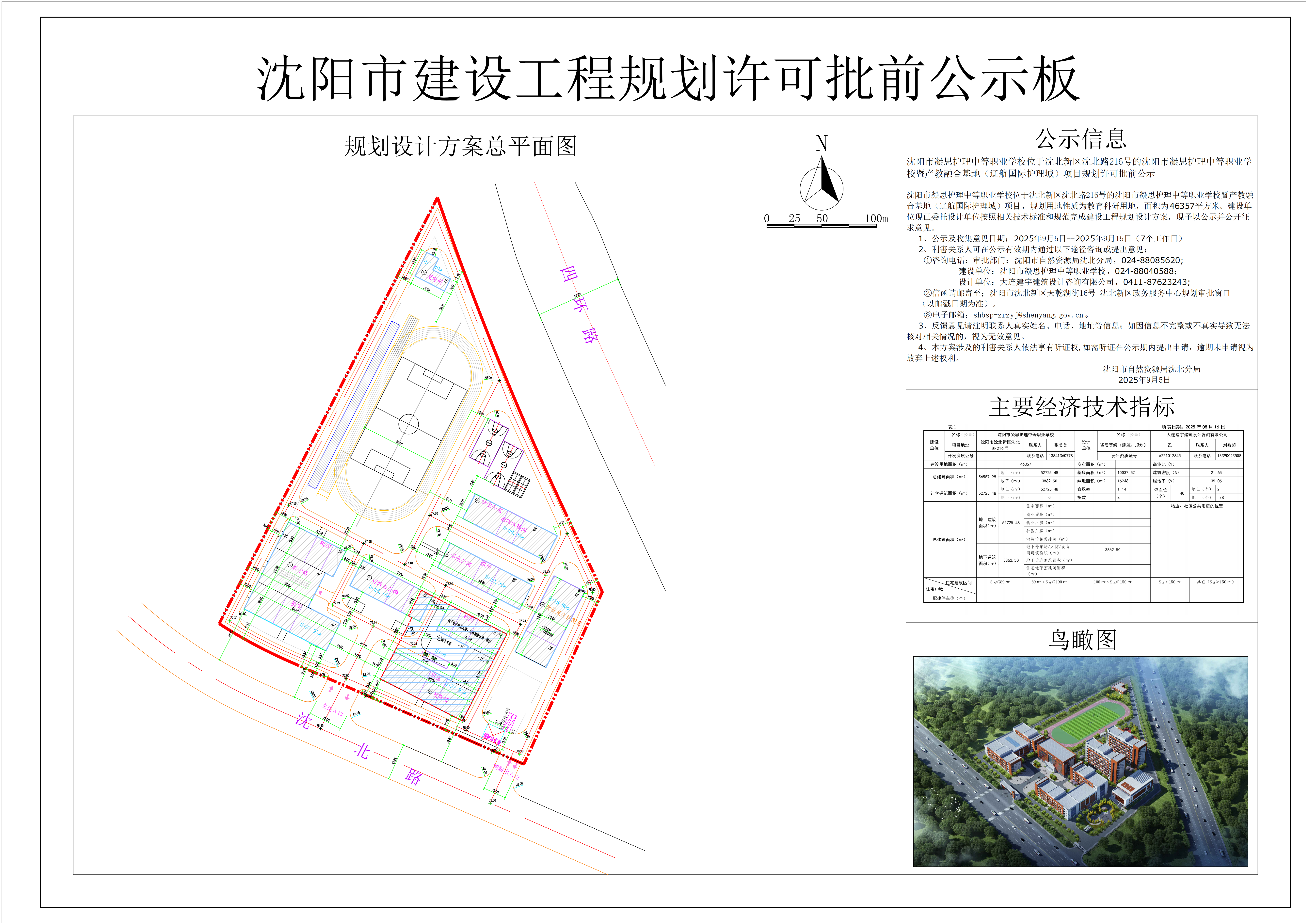 沈阳市凝思护理中等职业学校位于沈北新区沈北路216号的沈阳市凝思护理中等职业学校暨产教融合基地(辽航国际护理城)项目,规划用地性质为教育科研用地,面积为46357平方米。建设单位现已委托设计单位按照相关技术标准和规范完成建设工程规划设计方案,现予以公示并公开征求意见。 1、公示及收集意见日期:2025年9月5日——2023年9月15日(7个工作日) 2、利害关系人可在公示有效期内通过以下途径咨询或提出意见: ①咨询电话: 审批部门:沈阳市自然资源局沈北分局,024-88085620; 建设单位:沈阳市凝思护理中等职业学校,024-88040588; 设计单位:大连建宇建筑设计咨询有限公司,0411-87623243; ②信函请邮寄至;沈阳市沈北新区天乾湖街16号 沈北新区政务服务中心规划审批窗口(以邮戳日期为准) ③电子邮箱:shbsp-zrzyj@shenyang.gov.cn 3、反馈意见请注明联系人真实姓名、电话、地址等信息;如因信息不完整或不真实导致无法核对相关情况的,视为无效意见。 4、本方案涉及的利害关系人依法享有听证权,如需听证在公示期内提出申请,逾期未申请视为放弃上述权利。 沈阳市自然资源局沈北分局 2025年9月5日