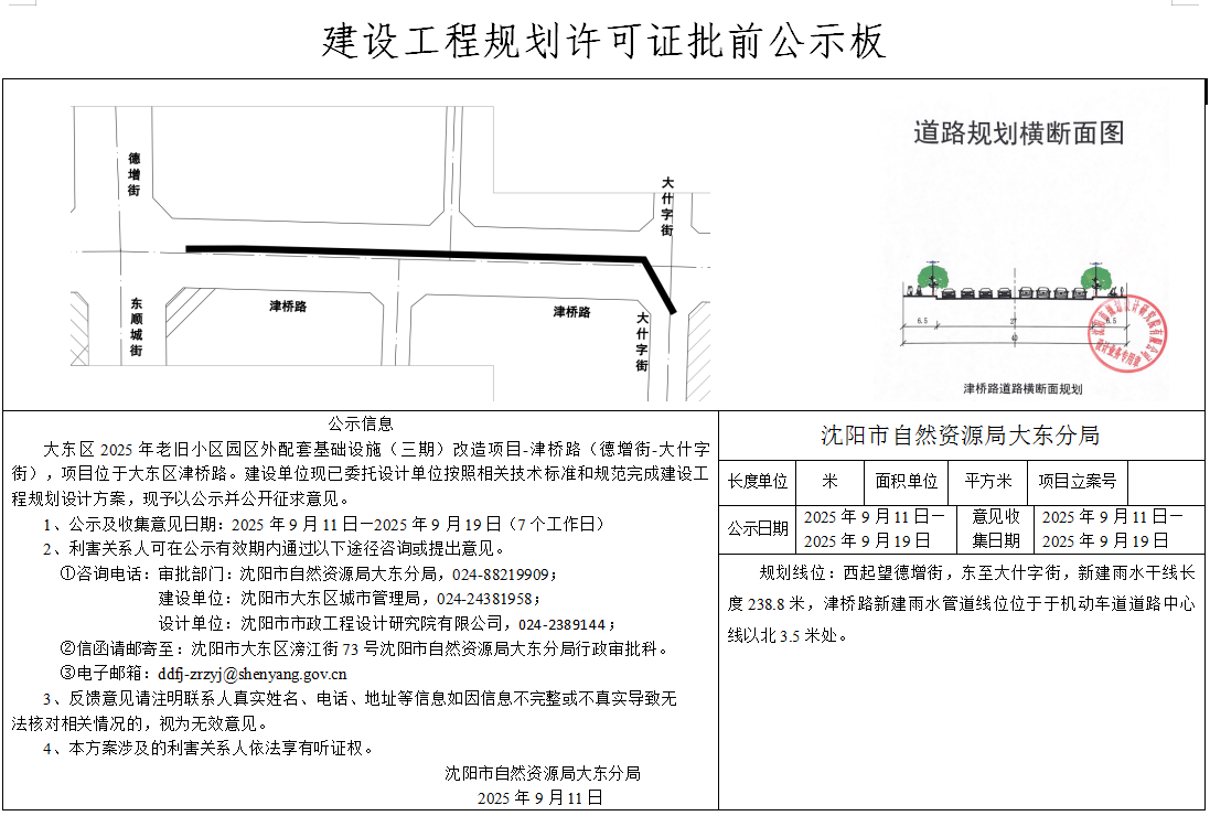 大东区2025年老旧小区园区外配套基础设施(三期)改造项目-津桥路(德增街-大什字街),项目位于大东区津桥路。建设单位现已委托设计单位按照相关技术标准和规范完成建设工程规划设计方案,现予以公示并公开征求意见。 1、公示及收集意见日期:2025年9月11日—2025年9月19日(7个工作日) 2、利害关系人可在公示有效期内通过以下途径咨询或提出意见。 ①咨询电话: 审批部门:沈阳市自然资源局大东分局,024-88219909; 建设单位:沈阳市大东区城市管理局,024-24381958; 设计单位:沈阳市市政工程设计研究院有限公司,024-2389144; ②信函请邮寄至:沈阳市大东区滂江街73号沈阳市自然资源局大东分局行政审批科。 ③电子邮箱:ddfj-zrzyj@shenyang.gov.cn 3、反馈意见请注明联系人真实姓名、电话、地址等信息,如因信息不完整或不真实导致无法核对相关情况的,视为无效意见。 4、本方案涉及的利害关系人依法享有听证权。 沈阳市自然资源局大东分局 2025年9月11日