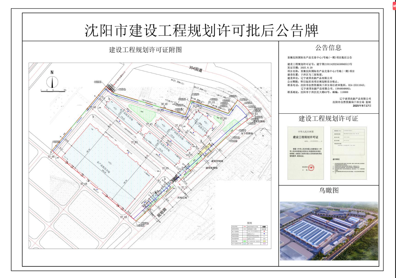 建设工程规划许可证号:建字第2101142025GG0040513号 发证日期:2025.8.20 项目名称:首衡沈阳国际农产品交易中心1号地(一期)项目 建设位置:于洪区马三家街道。 建设单位:辽宁凌顶农副产品有限公司 公示期限:即日起至该项目规划核实合格止。 联系电话:沈阳市自然资源局于洪分局行政审批科,024-25311043; 辽宁凌顶农副产品有限公司,13840048682; 联系地址:沈阳市于洪区沈大路63号,邮编:110000