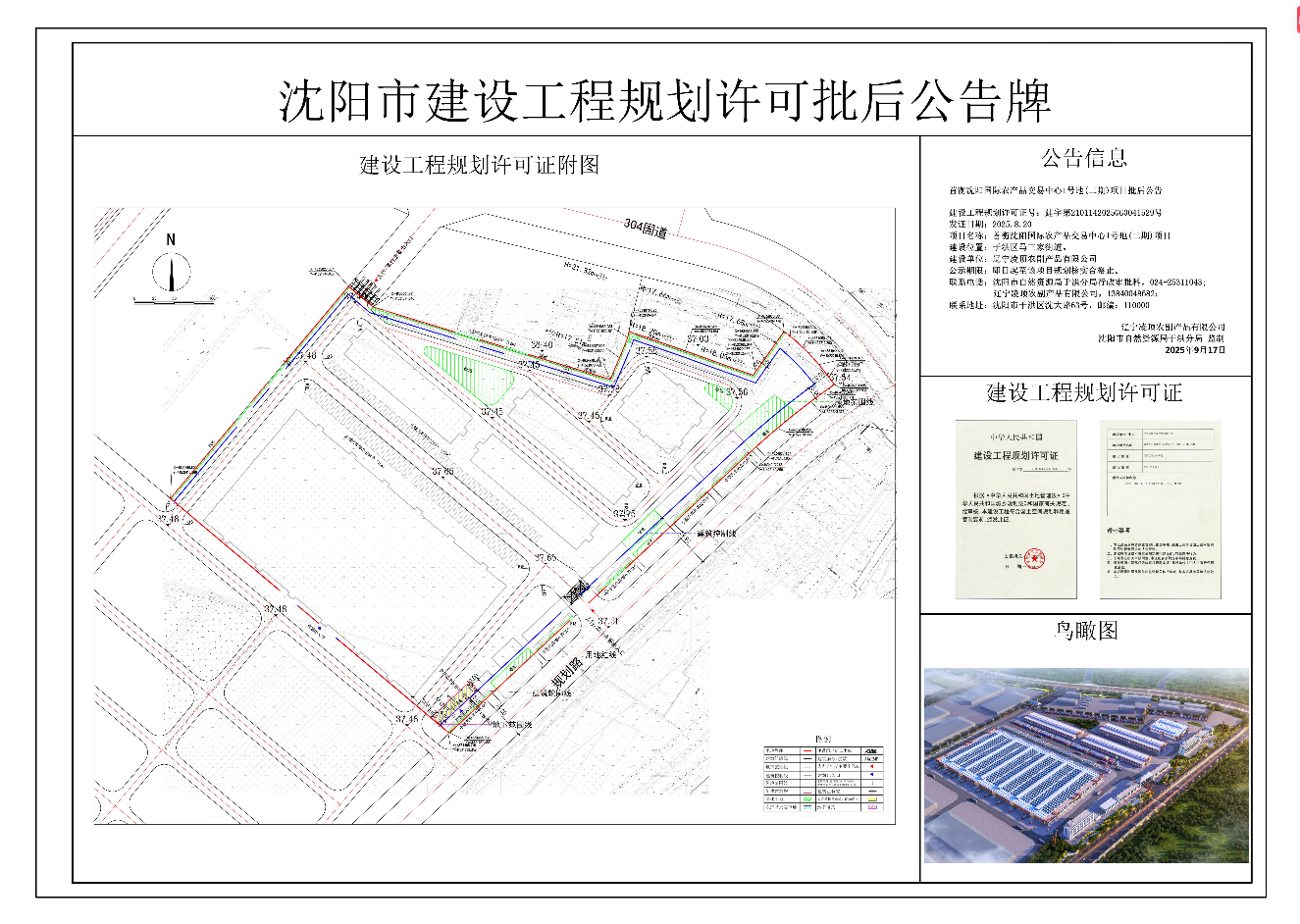 建设工程规划许可证号:建字第2101142025GG0041529号 发证日期:2025.8.20 项目名称:首衡沈阳国际农产品交易中心1号地(二期)项目 建设位置:于洪区马三家街道。 建设单位:辽宁凌顶农副产品有限公司 公示期限:即日起至该项目规划核实合格止。 联系电话:沈阳市自然资源局于洪分局行政审批科,024-25311043; 辽宁凌顶农副产品有限公司,13840048682; 联系地址:沈阳市于洪区沈大路63号,邮编:110000