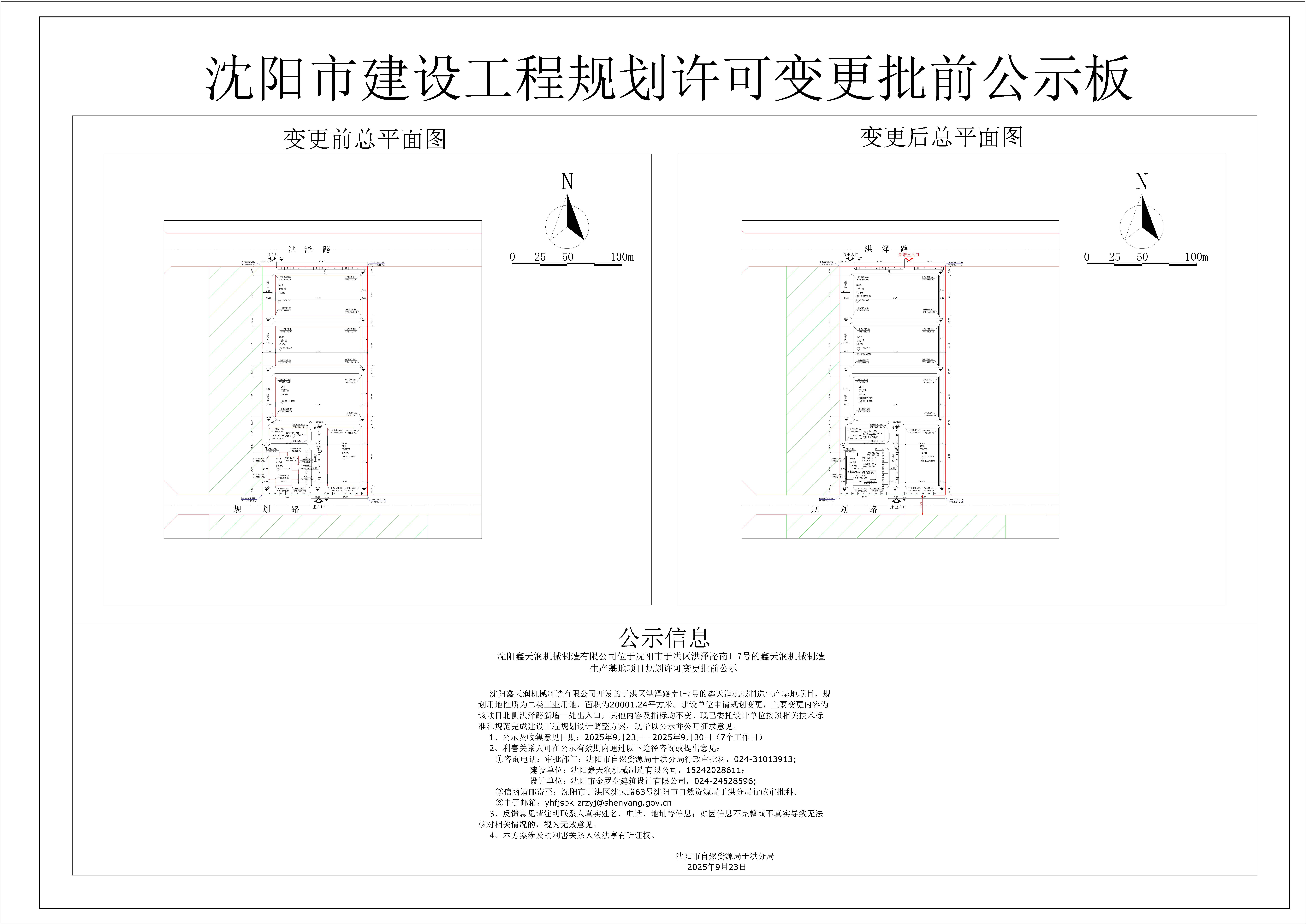 沈阳鑫天润机械制造有限公司开发的沈阳市于洪区洪泽路南1-7号的鑫天润机械制造生产基地项目,规划用地性质为二类工业用地,用地面积为20001.24平方米。建设单位申请规划变更,主要变更内容为该项目北侧洪泽路新增一处出入口,其他内容及指标均不变。现已委托设计单位按照相关技术标准和规范完成建设工程规划设计调整方案,现予以公示并公开征求意见。 1、公示及收集意见日期:2025年9月23日--2025年9月30日(7个工作日) 2、利害关系人可在公示有效期内通过以下途径咨询或提出意见: ①咨询电话: 审批部门:沈阳市自然资源局于洪分局行政审批科,024-31013913; 建设单位:沈阳鑫天润机械制造有限公司,15242028611; 设计单位:沈阳市金罗盘建筑设计有限公司,024-24528596; ②信函请邮寄至;沈阳市于洪区沈大路63号沈阳市自然资源局于洪分局行政审批科。 ③电子邮箱:yhfjspk-zrzyj@shenyang.gov.cn 3、反馈意见请注明联系人真实姓名、电话、地址等信息;如因信息不完整或不真实导致无法核对相关情况的,视为无效意见。 4、本方案涉及的利害关系人依法享有听证权。 沈阳市自然资源局于洪分局 2025年9月23日