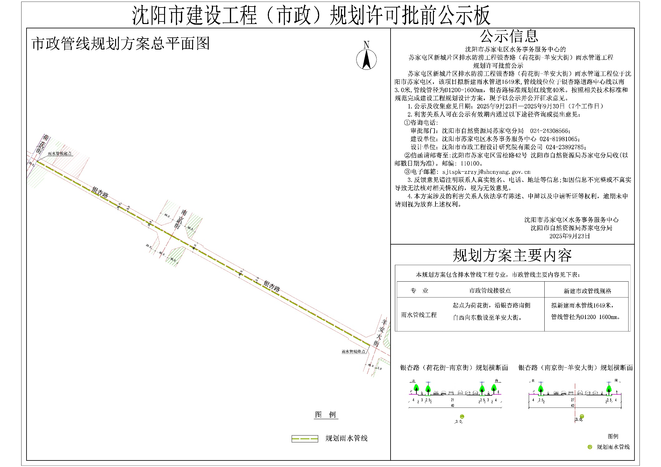 沈阳市苏家屯区水务事务服务中心的苏家屯区新城片区排水防涝工程银杏路(荷花街-羊安大街)雨水管道工程位于沈阳市苏家屯区,该项目拟新建雨水管道1649米,管线线位位于银杏路道路中心线以南3.0米,管线管径为D1200-1600mm,银杏路标准规划红线宽40米。按照相关技术标准和规范完成建设工程规划设计方案,现予以公示并公开征求意见。 1、公示及收集意见日期:2025年9月23日—2025年9月30日(7个工作日) 2、利害关系人可在公示有效期内通过以下途径咨询或提出意见: ①咨询电话: 审批部门:沈阳市自然资源局苏家屯分局,024-24308566; 建设单位:沈阳市苏家屯区水务事务服务中心,024-81981065; 设计单位:沈阳市市政工程设计研究院有限公司,024-23892785; ②信函请邮寄至: 沈阳市苏家屯区雪松路42号,沈阳市自然资源局苏家屯分局收(以邮戳日期为准)。邮编: 110100。 ③电子邮箱:sjtspk-zrzyj@shenyang.gov.cn 3、反馈意见请注明联系人真实姓名、电话、地址等信息;如因信息不完整或不真实导致无法核对相关情况的,视为无效意见。 4、本方案涉及的利害关系人依法享有陈述、申辩以及申请听证等权利,逾期未申请则视为放弃上述权利。 沈阳市苏家屯区水务事务服务中心 沈阳市自然资源局苏家屯分局 2025年9月23日