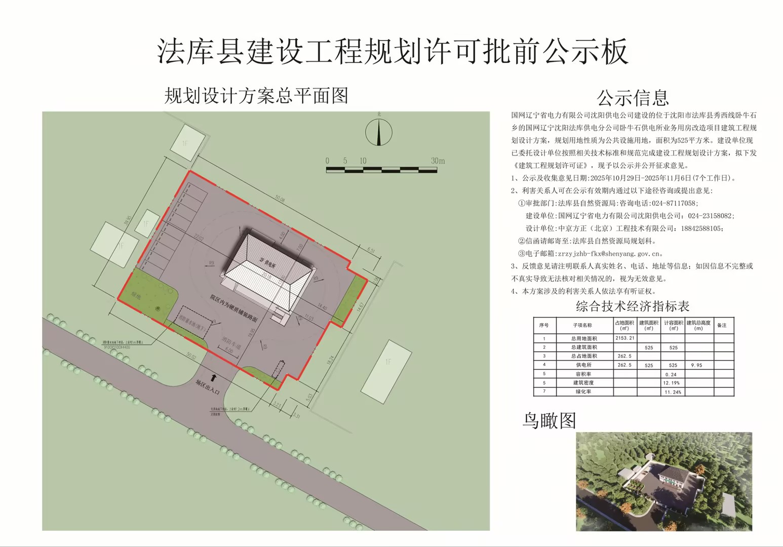 国网辽宁省电力有限公司沈阳供电公司建设的位于沈阳市法库县秀西线卧牛石乡的国网辽宁沈阳法库供电分公司卧牛石供电所业务用房改造项目建筑工程规划设计方案,规划用地性质为公共设施用地,面积为525平方米。建设单位现已委托设计单位按照相关技术标准和规范完成建设工程规划设计方案,拟下发《建筑工程规划许可证》,现予以公示并公开征求意见。 1、公示及收集意见日期:2025年10月29日-2025年11月6日(7个工作日)。 2、利害关系人可在公示有效期内通过以下途径咨询或提出意见: ①审批部门:法库县自然资源局:咨询电话:024-87117058; 建设单位:国网辽宁省电力有限公司沈阳供电公司:024-23158082; 设计单位:中京方正(北京)工程技术有限公司:18842588105; ②信函请邮寄至:法库县自然资源局规划科。 ③电子邮箱:zrzyjzhb-fkx@shenyang.gov.cn 3、反馈意见请注明联系人真实姓名、电话、地址等信息;如因信息不完整或不真实导致无法核对相关情况的,视为无效意见。 4、本方案涉及的利害关系人依法享有听证权。 法库县自然资源局 2025年10月29日