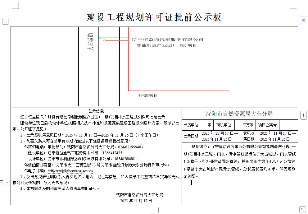 辽宁恒益通汽车服务有限公司智能制造产业园(一期)项目排水工程规划许可批前公示