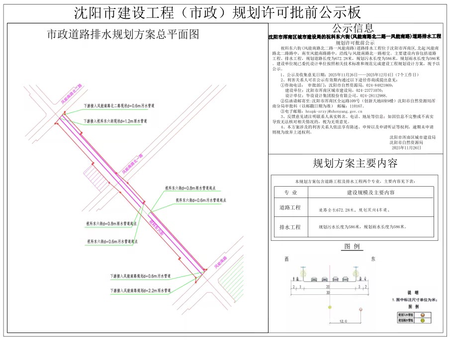 祝科东六街(风能南路北二路-风能南路)道路排水工程,位于沈阳市浑南区,北起风能南路北二路路中,南至风能南路路中,沿线与风能南路北一路相交。主要建设内容包括道路工程、排水工程,规划道路长度为672.28米,规划污水长度为586米,规划雨水长度为586米;建设单位现已委托设计单位按照相关技术标准和规范完成建设工程规划设计方案,现予以公示并公开征求意见。 1、公示及收集意见日期:2025年11月26日——2025年12月4日(7个工作日) 2、利害关系人可在公示有效期内通过以下途径咨询或提出意见: ①咨询电话: 审批部门:沈阳市自然资源局,024-84821869; 建设单位:沈阳市浑南区城市建设局,024-23771070; 设计单位:华设设计集团股份有限公司,024-28112988。 ②信函请邮寄至:沈阳市浑南区全运路109号(创新天地H座9楼)沈阳市自然资源局浑南分局审批科(以邮戳日期为准) 邮编:110167。 ③电子邮箱:hnspk-zrzyj@shenyang.gov.cn 3、反馈意见请注明联系人真实姓名、电话、地址等信息;如因信息不完整或不真实导致无法核对相关情况的,视为无效意见。 4、本方案涉及的利害关系人依法享有陈述、申辩以及申请听证等权利,逾期未申请则视为放弃上述权利。 沈阳市浑南区城市建设局 沈阳市自然资源局 2025年11月26日