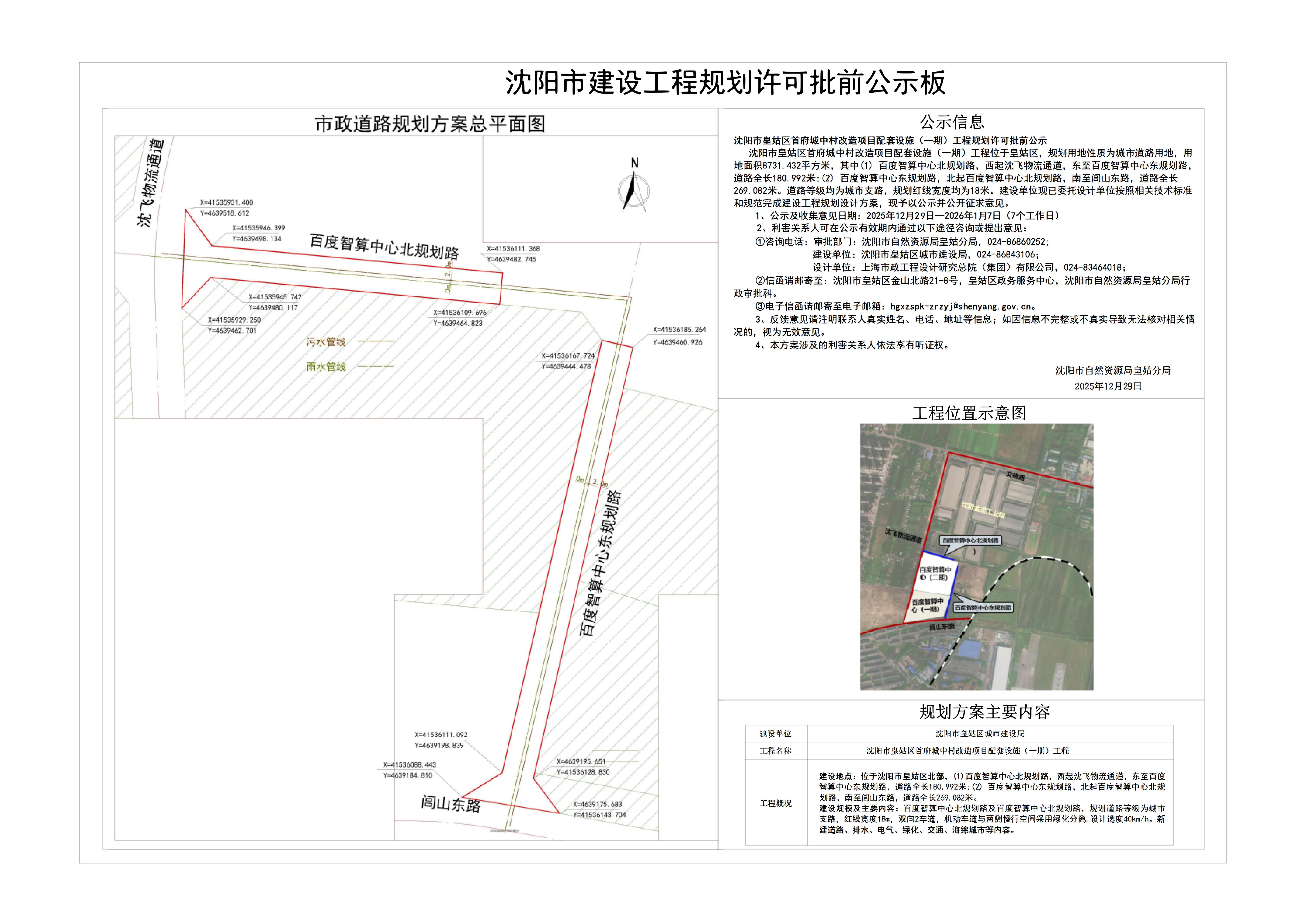 沈阳市皇姑区首府城中村改造项目配套设施(一期)工程位于皇姑区,规划用地性质为城市道路用地,用地面积8731.432平方米,其中:(1) 百度智算中心北规划路,西起沈飞物流通道,东至百度智算中心东规划路,道路全长180.992米;(2) 百度智算中心东规划路,北起百度智算中心北规划路,南至闾山东路,道路全长269.082米。道路等级均为城市支路,规划红线宽度均为18米。建设单位现已委托设计单位按照相关技术标准和规范完成建设工程规划设计方案,现予以公示并公开征求意见。 1、公示及收集意见日期:2025年12月29日——2026年1月7日(7个工作日) 2、利害关系人可在公示有效期内通过以下途径咨询或提出意见: ①咨询电话: 审批部门:沈阳市自然资源局皇姑分局,024-86860252; 建设单位:沈阳市皇姑区城市建设局,024-86843106; 设计单位:上海市政工程设计研究总院(集团)有限公司,024-83464018; ②信函请邮寄至:沈阳市皇姑区金山北路21-8号,皇姑区政务服务中心,沈阳市自然资源局皇姑分局行政审批科。 ③电子信函请邮寄至电子邮箱:hgxzspk-zrzyj@shenyang.gov.cn 3、反馈意见请注明联系人真实姓名、电话、地址等信息;如因信息不完整或不真实导致无法核对相关情况的,视为无效意见。 4、本方案涉及的利害关系人依法享有听证权。 沈阳市自然资源局皇姑分局 2025年12月29日