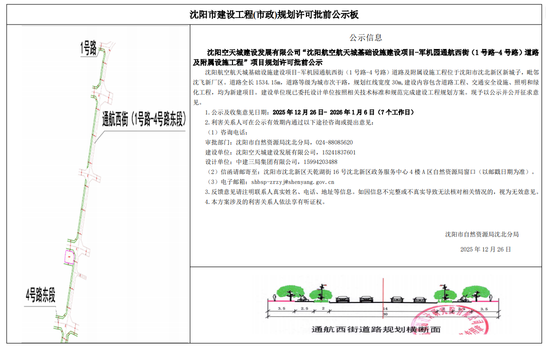 沈阳航空航天城基础设施建设项目-军机园通航西街(1号路-4号路)道路及附属设施工程位于沈阳市沈北新区新城子,毗邻沈飞新厂区。道路全长1534.15m,道路等级为城市次干路,规划红线宽度30m,建设内容包含道路工程、交通安全设施、照明和绿化工程,均为新建项目。建设单位现已委托设计单位按照相关技术标准和规范完成建设工程规划方案。现予以公示并公开征求意见。 1.公示及收集意见日期:2025年12月26日- 2026年1月6日(7个工作日) 2.利害关系人可在公示有效期内通过以下途径咨询或提出意见: (1)咨询电话: 审批部门:沈阳市自然资源局沈北分局,024-88085620 建设单位:沈阳空天城建设发展有限公司,15241837601 设计单位:中建三局集团有限公司,15994203488 (2)信函请邮寄至:沈阳市沈北新区天乾湖街16号沈北新区政务服务中心4楼A区自然资源局窗口(以邮戳日期为准) (3)电子邮箱:shbsp-zrzyj@shenyang.gov.cn 3.反馈意见请注明联系人真实姓名、电话、地址等信息。如因信息不完整或不真实导致无法核对相关情况的,视为无效意见。 4.本方案涉及的利害关系人依法享有听证权。 沈阳市自然资源局沈北分局 2025年12月26日