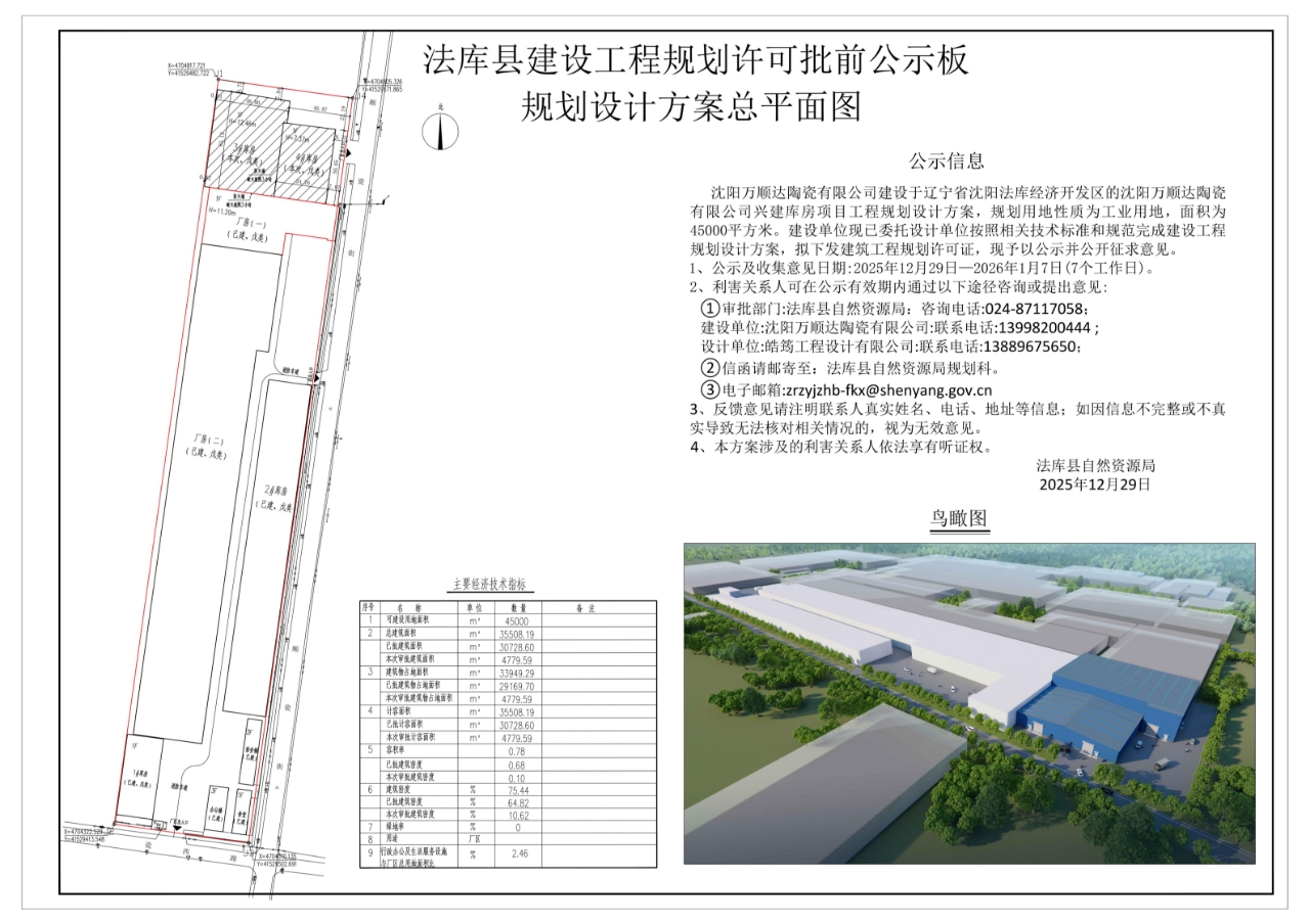 沈阳万顺达陶瓷有限公司建设于辽宁省沈阳法库经济开发区的沈阳万顺达陶瓷有限公司兴建库房项目工程规划设计方案,规划用地性质为工业用地,面积为45000平方米。建设单位现已委托设计单位按照相关技术标准和规范完成建设工程规划设计方案,拟下发建筑工程规划许可证,现予以公示并公开征求意见。 1、公示及收集意见日期:2025年12月29日—2026年1月7日(7个工作日)。 2、利害关系人可在公示有效期内通过以下途径咨询或提出意见: ①审批部门:法库县自然资源局:咨询电话:024-87117058; 建设单位:沈阳万顺达陶瓷有限公司:联系电话:13998200444 ; 设计单位:皓筠工程设计有限公司:联系电话:13889675650; ②信函请邮寄至:法库县自然资源局规划科。 ③电子邮箱:zrzyjzhb-fkx@shenyang.gov.cn 3、反馈意见请注明联系人真实姓名、电话、地址等信息;如因信息不完整或不真实导致无法核对相关情况的,视为无效意见。 4、本方案涉及的利害关系人依法享有听证权。 法库县自然资源局 2025年12月29日
