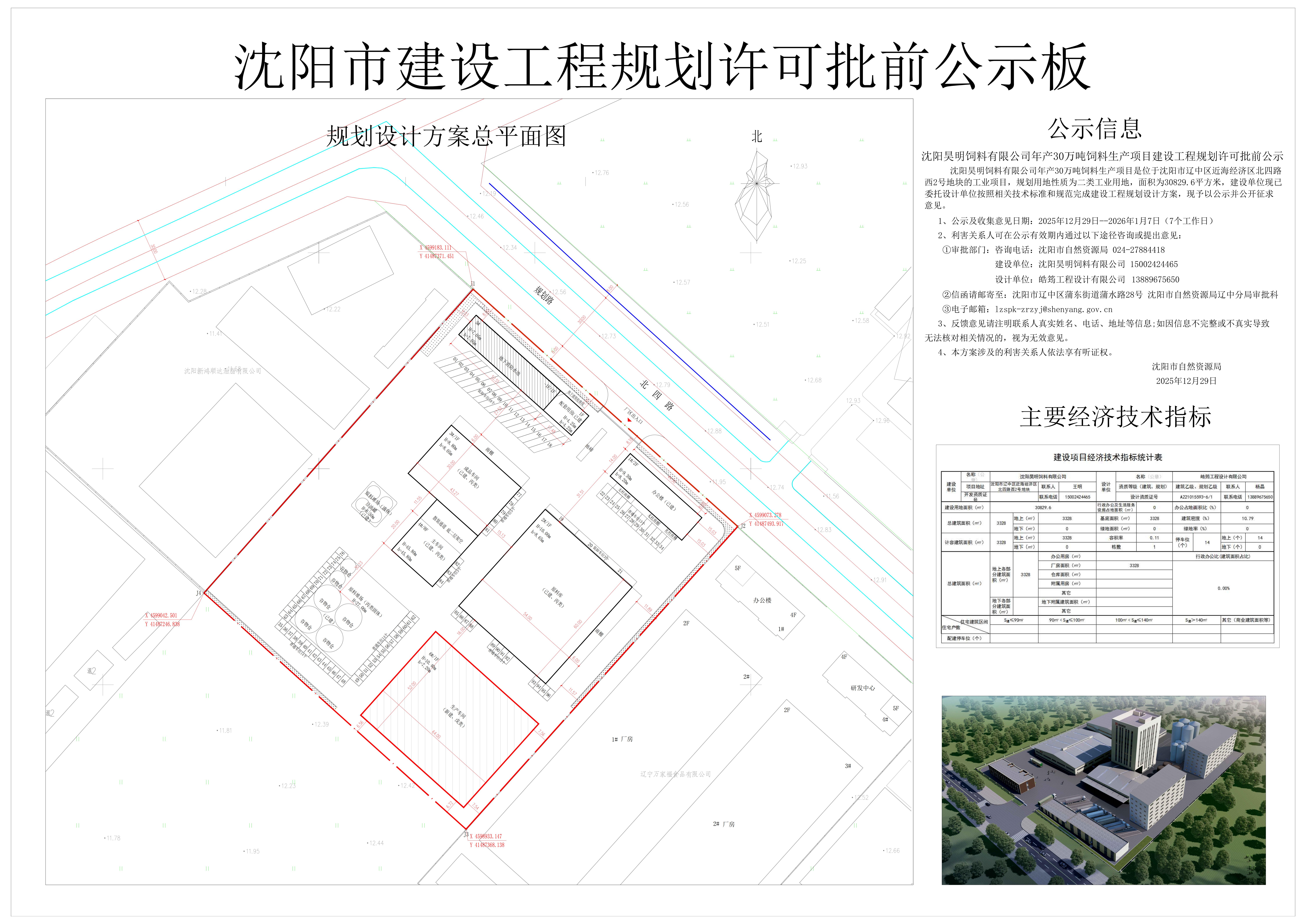 沈阳昊明饲料有限公司年产30万吨饲料生产项目是位于沈阳市辽中区近海经济区北四路西2号地块的工业项目,规划用地性质为二类工业用地,面积为30829.6平方米,建设单位现已委托设计单位按照相关技术标准和规范完成建设工程规划设计方案,现予以公示并公开征求意见。 1、公示及收集意见日期:2025年12月29日——2026年1月7日(7个工作日) 2、利害关系人可在公示有效期内通过以下途径咨询或提出意见: ①审批部门: 咨询电话:沈阳市自然资源局,024-27884418 建设单位:沈阳昊明饲料有限公司,15002424465 设计单位:皓筠工程设计有限公司,13889675650 ②信函请邮寄至:沈阳市辽中区蒲东街道蒲水路28号,沈阳市自然资源局辽中分局审批科。 ③电子邮箱:lzspk-zrzyj@shenyang.gov.cn 3、反馈意见请注明联系人真实姓名、电话、地址等信息;如因信息不完整或不真实导致无法核对相关情况的,视为无效意见。 4、本方案涉及的利害关系人依法享有听证权。 沈阳市自然资源局 2025年12月29日