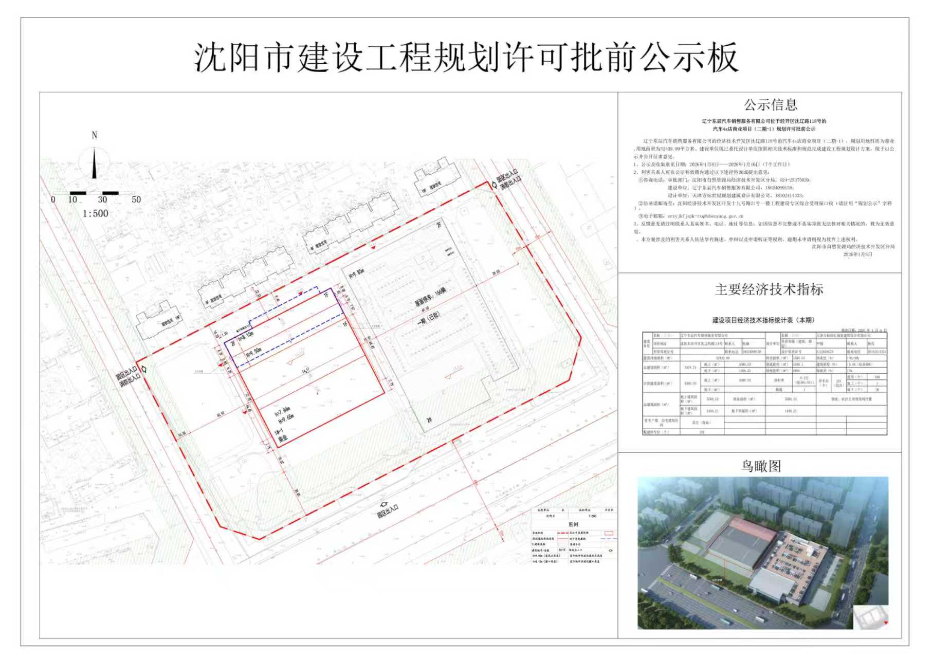 辽宁东辰汽车销售服务有限公司的经济技术开发区沈辽路118号的汽车4s店商业项目(二期-1),规划用地性质为商业,用地面积为32439.99平方米。建设单位现已委托设计单位按照相关技术标准和规范完成建设工程规划设计方案,现予以公示并公开征求意见。 1、公示及收集意见日期:2026年1月8日——2026年1月16日(7个工作日) 2、利害关系人可在公示有效期内通过以下途径咨询或提出意见: ①咨询电话: 审批部门:沈阳市自然资源局经济技术开发区分局,024-25375039; 建设单位:辽宁东辰汽车销售服务有限公司,18624099158; 设计单位:天津方标世纪规划建筑设计有限公司,18102414333; ②信函请邮寄至:沈阳经济技术开发区开发十九号路21号一楼工程建设专区综合受理窗口收(请注明“规划公示”字样) ③电子邮箱:zrzyjkfjspk-txq@shenyang.gov.cn 3、反馈意见请注明联系人真实姓名、电话、地址等信息;如因信息不完整或不真实导致无法核对相关情况的,视为无效意见。 4、本方案涉及的利害关系人依法享有陈述、申辩以及申请听证等权利,逾期未申请则视为放弃上述权利。 沈阳市自然资源局经济技术开发区分局 2026年1月8日