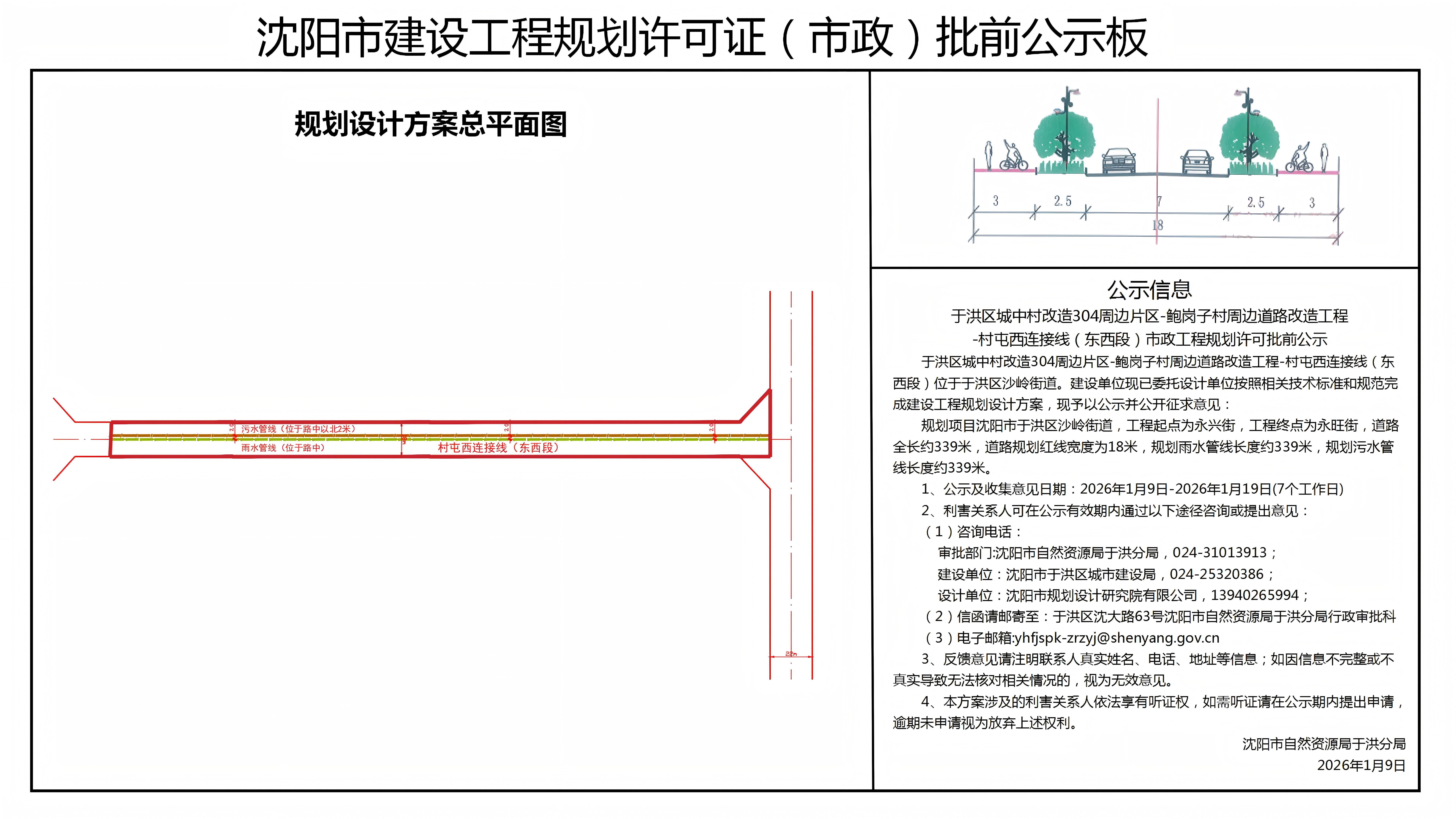 于洪区城中村改造304周边片区-鲍岗子村周边道路改造工程-村屯西连接线(东西段)位于于洪区沙岭街道。建设单位现已委托设计单位按照相关技术标准和规范完成建设工程规划设计方案,现予以公示并公开征求意见: 规划项目沈阳市于洪区沙岭街道,工程起点为永兴街,工程终点为永旺街,道路全长约339米,道路规划红线宽度为18米,规划雨水管线长度约339米,规划污水管线长度约339米。 1、公示及收集意见日期:2026年1月9日-2026年1月19日(7个工作日) 2、利害关系人可在公示有效期内通过以下途径咨询或提出意见: (1)咨询电话: 审批部门:沈阳市自然资源局于洪分局,024-31013913; 建设单位:沈阳市于洪区城市建设局,024-25320386; 设计单位:沈阳市规划设计研究院有限公司,13940265994; (2)信函请邮寄至:于洪区沈大路63号沈阳市自然资源局于洪分局行政审批科 (3)电子邮箱:yhfjspk-zrzyj@shenyang.gov.cn 3、反馈意见请注明联系人真实姓名、电话、地址等信息;如因信息不完整或不真实导致无法核对相关情况的,视为无效意见。 4、本方案涉及的利害关系人依法享有听证权,如需听证请在公示期内提出申请,逾期未申请视为放弃上述权利。 沈阳市自然资源局于洪分局 2026年1月9日
